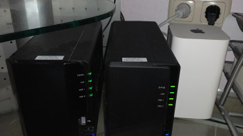 links steht meine DS218+ auf der HB auf einem Docker lĂ€uft, rechts daneben eine DS218play, die dient als Backup fĂŒr die 218+, wiederum daneben steht die Time Capsule fĂŒr das Backup der TimeMaschine des MacBook Pro meiner Frau und meines iMac