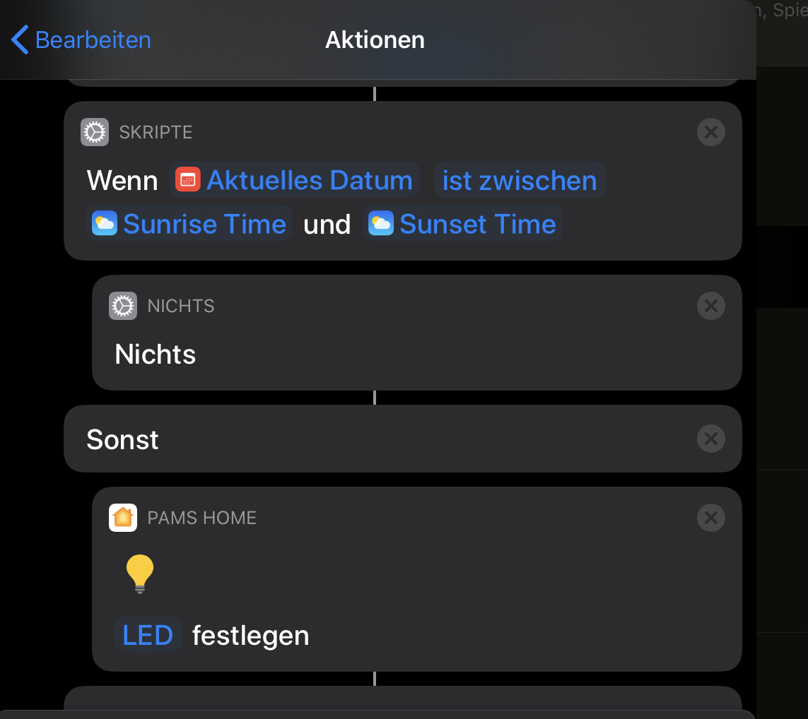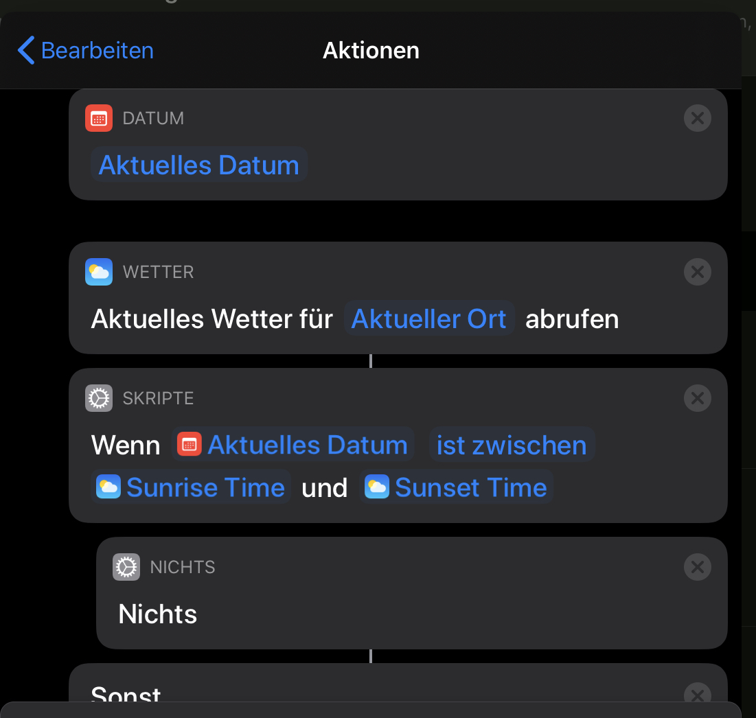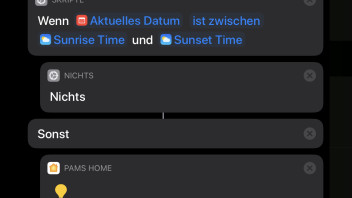 ich habe seit geraumer Zeit mein Homekit installiert. Soweit bin ich sehr zufrieden. Ich bin auf der Suche nach neuen Homekitfunktionen die verschachtelt werden können. So z.B. habe ich eine Routine für "Guten Morgen", diese startet den Homepod und schaltet das Licht im Haus ein. Das funktioniert im Winter sehr gut, aber im Sommer soll das Licht gar nicht erst eingeschaltet werden. Er soll prüfen, ob Sonnenaufgang ist, und dann das Licht gar nicht erst einschalten.