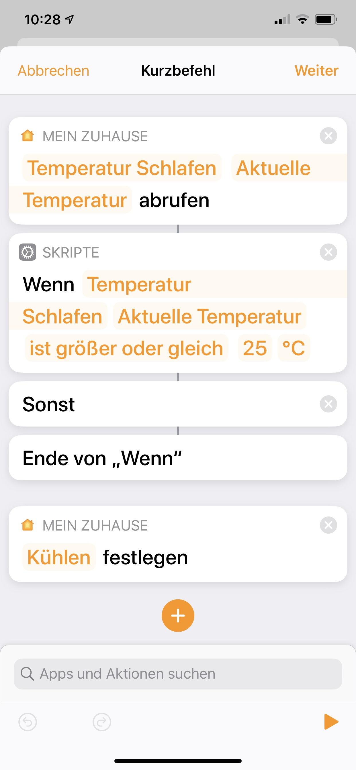 Nun möchte ich in einem smarten Home das gerne automatisch steuern und zwar immer dann wenn die Raumtemperatur einen bestimmten Schwellwert überschreitet - und als Zusätzliche Option - wenn das lokale Wetter z.B. „Heiß“ meldet. Letzteres ist eher Optional zu sehen.