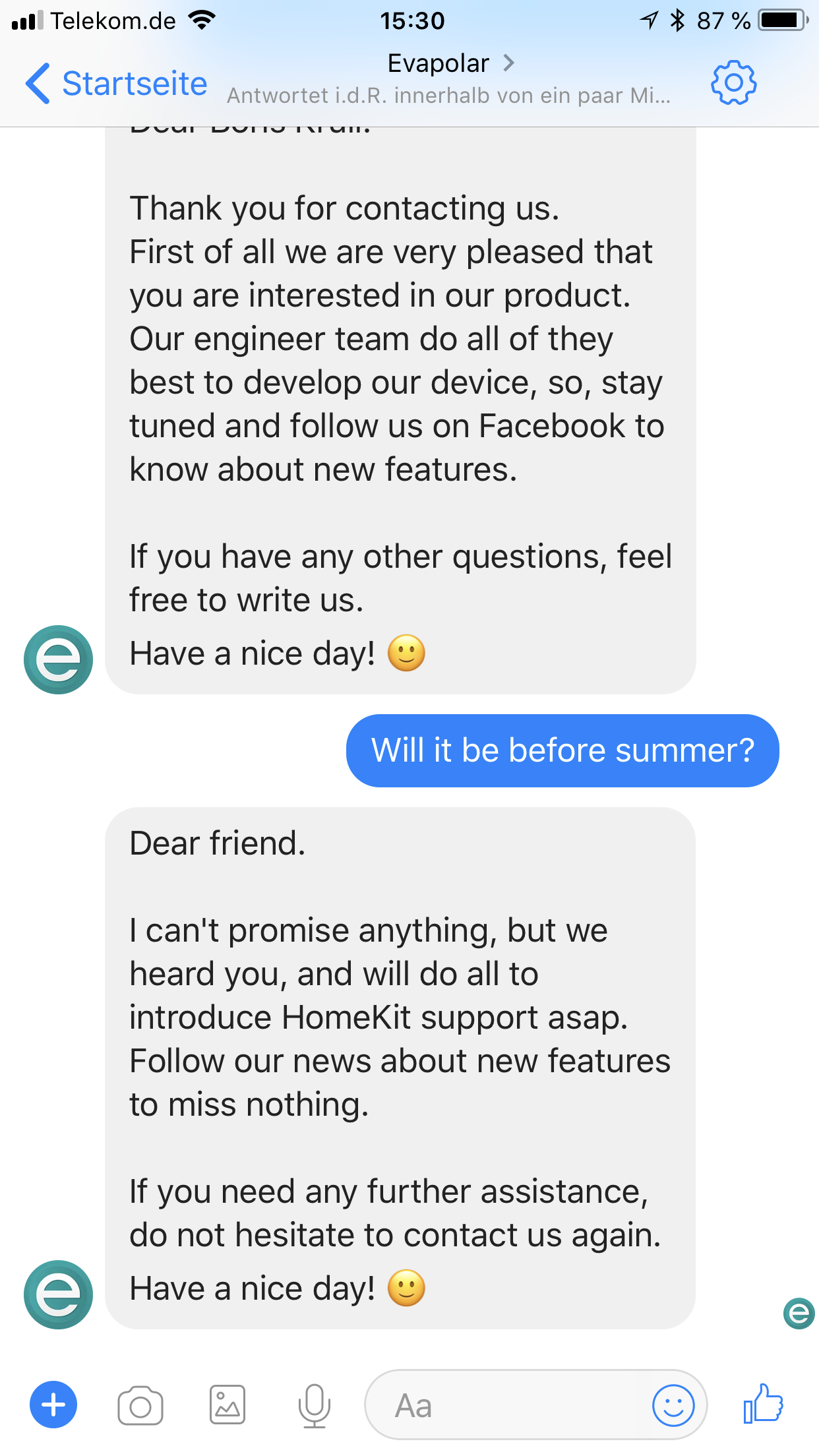 I’m confident that you understand my disappointment with evaSMART having problems from the first day on. And still can not use the device as advertised, promised and expected. As a moderator of a German fast growing smart home and HomeKit forum (http://forum.smartapfel.de/forum/), I unfortunately can not advertise or even recommend evaSMART at the moment. I’m very looking forward to your reply and kind help so I finally can use my evaSMART with all the features and be ready for all coming features with an update like HomeKit.