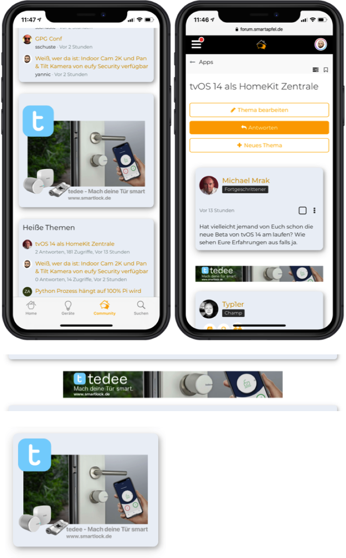 Wir haben die Partner Kachel und Banner dezent, optisch passend platziert, so dass es Euch beim Austausch und Stöbern nicht stört. Partner wie Tedee und smartlock.de aber auf diesem Weg doch eine gute Präsenz gibt. Zudem sind Aktionen auch für ein paar Wochen befristet.