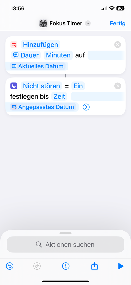 ich bekomme es leider alleine nicht hin und hoffe auf eure Hilfe. Ich möchte über einen Shortcut einen 45 Minuten Timer starten und gleichzeitig soll "nicht stören" aktiviert werden. Nach 45 Minuten soll "nicht stören" wieder automatisch deaktiviert werden. Der 45 Minuten Timer ist kein Problem. Bei nicht "stören aktivieren fängt das Problem an. Wie kann ich das auf 45 Minuten begrenzen?