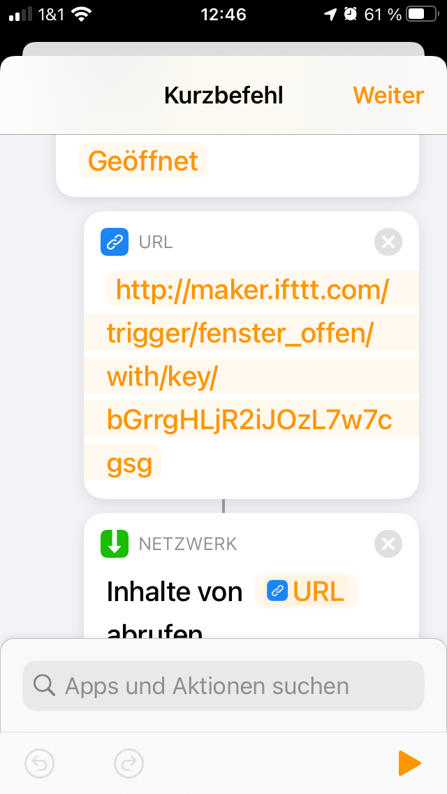 Dein Kurzbefehl wird durch deine Automation „wenn ein Sensor (Fenster Badezimmer) etwas entdeckt „ ausgelöst. Damit weiß der Kurzbefehl das mit dem offenen Fenster, wartet 20 mal 29 Sekunden und schickt dann die Nachricht per url raus.