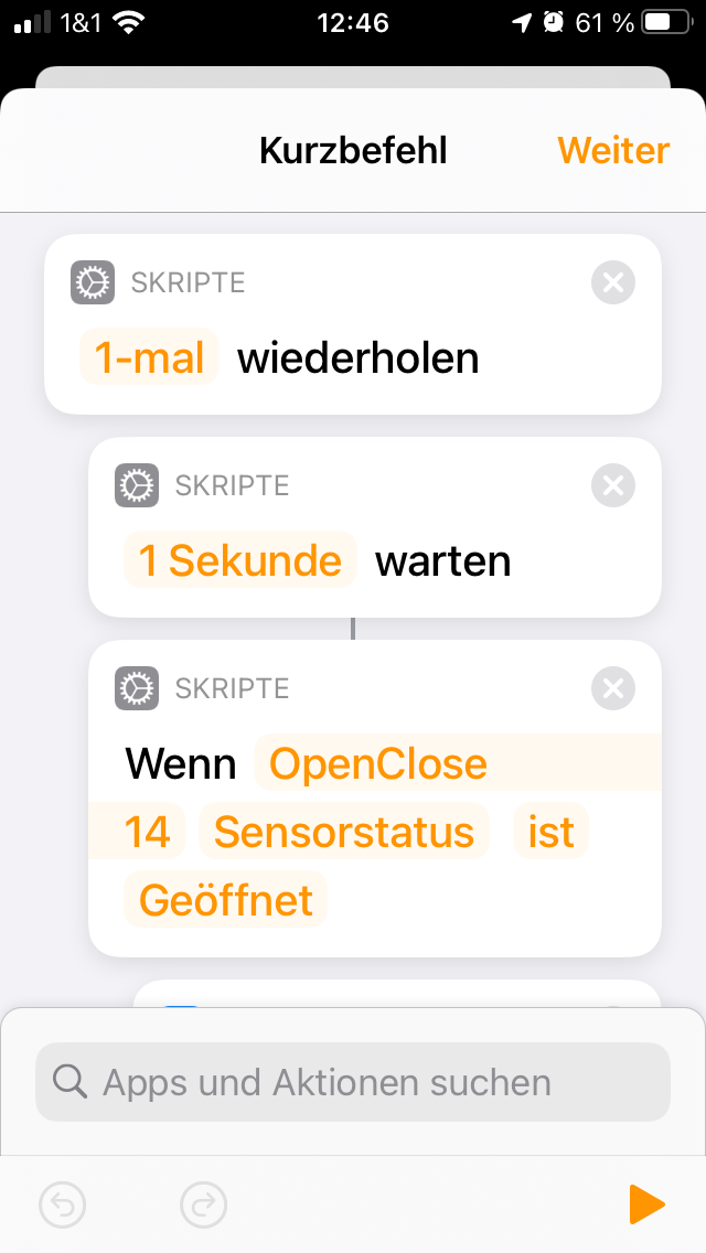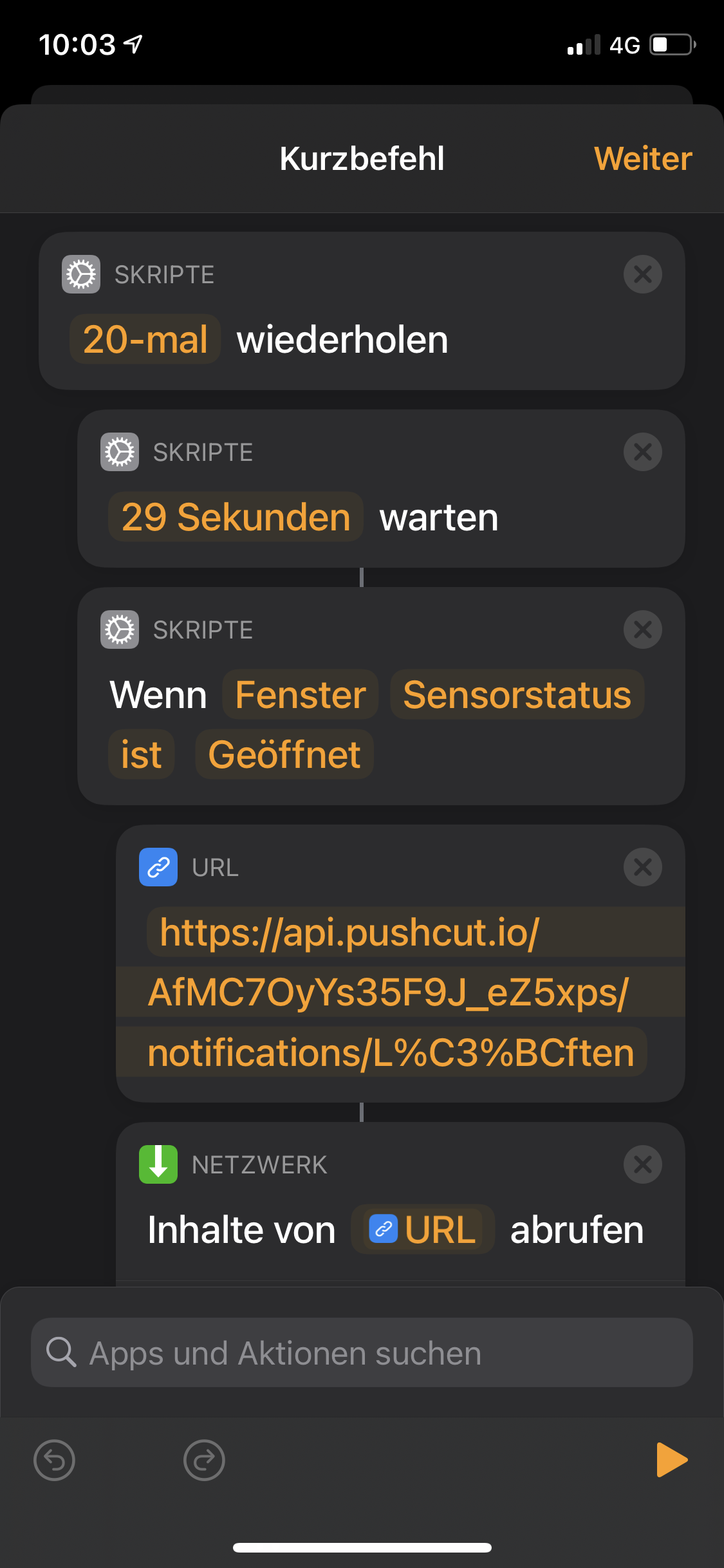 Dein Kurzbefehl wird durch deine Automation „wenn ein Sensor (Fenster Badezimmer) etwas entdeckt „ ausgelöst. Damit weiß der Kurzbefehl das mit dem offenen Fenster, wartet 20 mal 29 Sekunden und schickt dann die Nachricht per url raus.