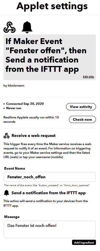 Merkwürdig... ich bin jetzt nochmal alles durchgegangen, habe nur nochmal den Namen des Events etwas für mich optimiert und nun funktioniert es. Kleiner Schönheitsfehler: Es kommt die Nachtricht die ich möchte ("Das Fenster ist noch offen") und zusätzlich eine Mitteilung von IFTTT: "Applet Run: If Maker Event "Fenster... Event occured on the Maker Webhooks service"