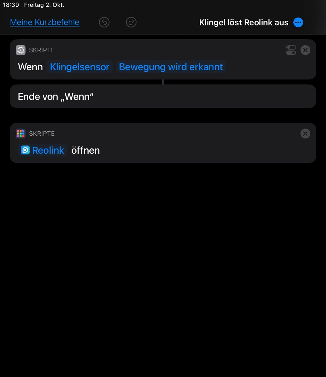Jetzt möchte ich gerne, dass beim Betätigen der Klingel sogleich auf dem iPad die App für die Außen-Kamera geöffnet wird, die den Eingangsbereich überwacht, damit man sofort sehen kann, wer vor der Tür steht. Deshalb habe ich versucht, einen entsprechenden Kurzbefehl anzulegen, s. Screenshot (der sprachlich etwas unpassende, aber an sich funktionierende Trigger lautet „Bewegung erkannt“). Leider funktioniert das nicht. Zwar kann ich über den Play-Button rechts oben diesen Effekt simulieren/auslösen. Das Betätigen des Klingeltasters führt das Script jedoch nicht aus.