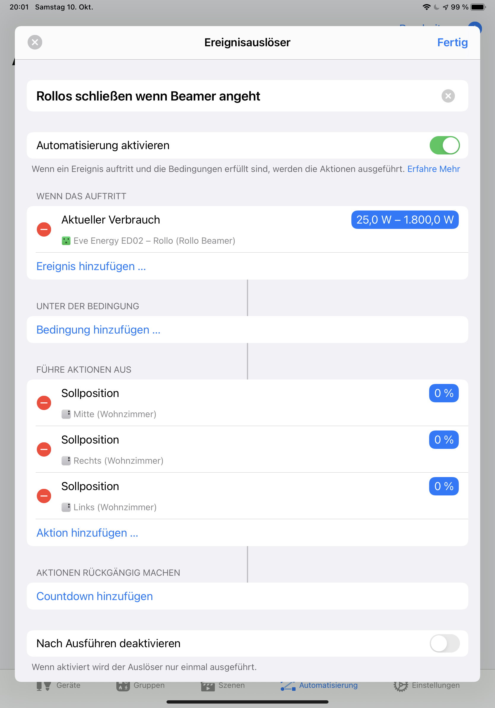 Mit Home+ die Automation das wenn Beamer angeht die Rollos sich schließen erstellt