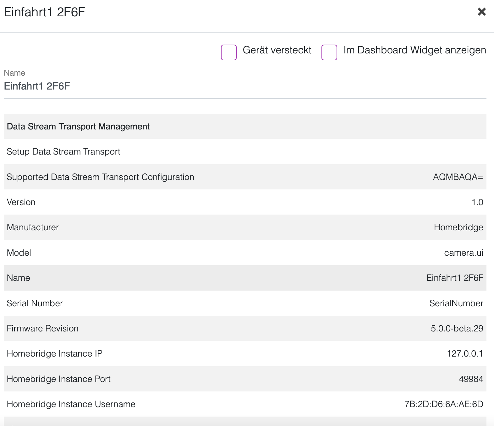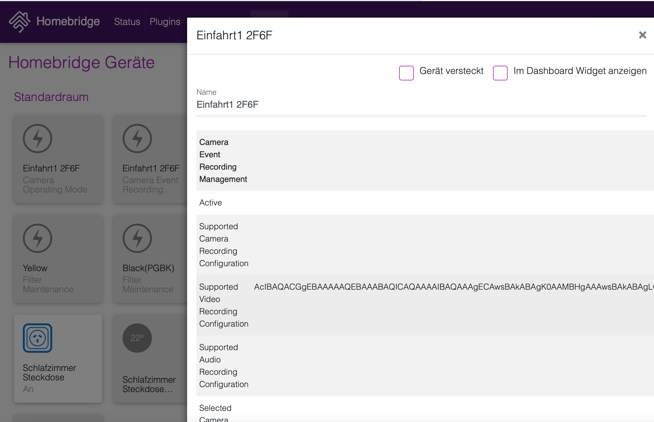 Das Homebridge Gerät "Einfahrt" Camera Event Recording hat auch ganz seltsame Einstellungen. Da stimmt was nicht.