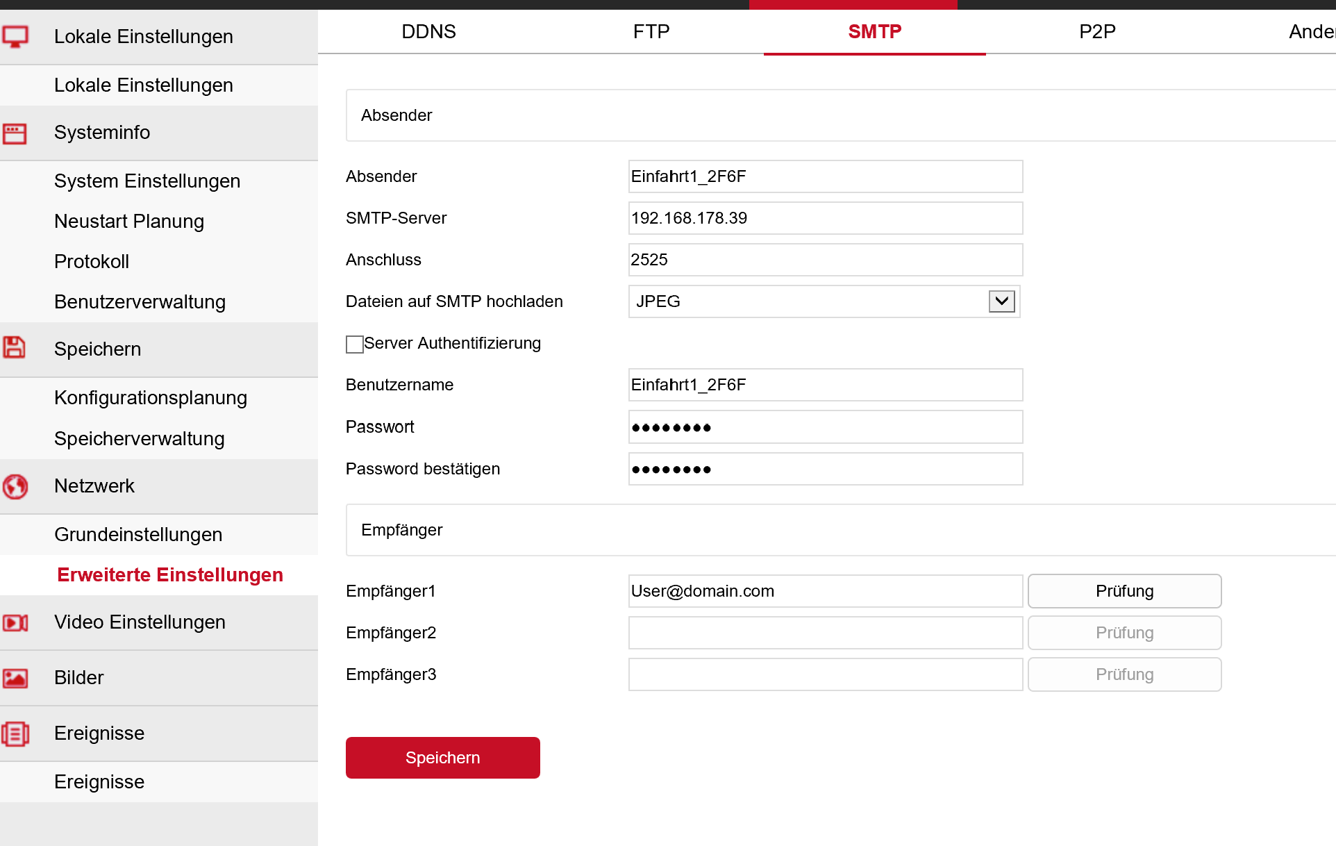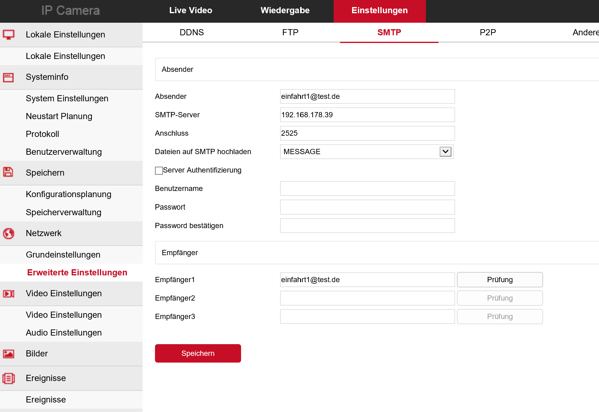 SMTP Server: IP Adresse vom Gerät wo camera.ui läuft