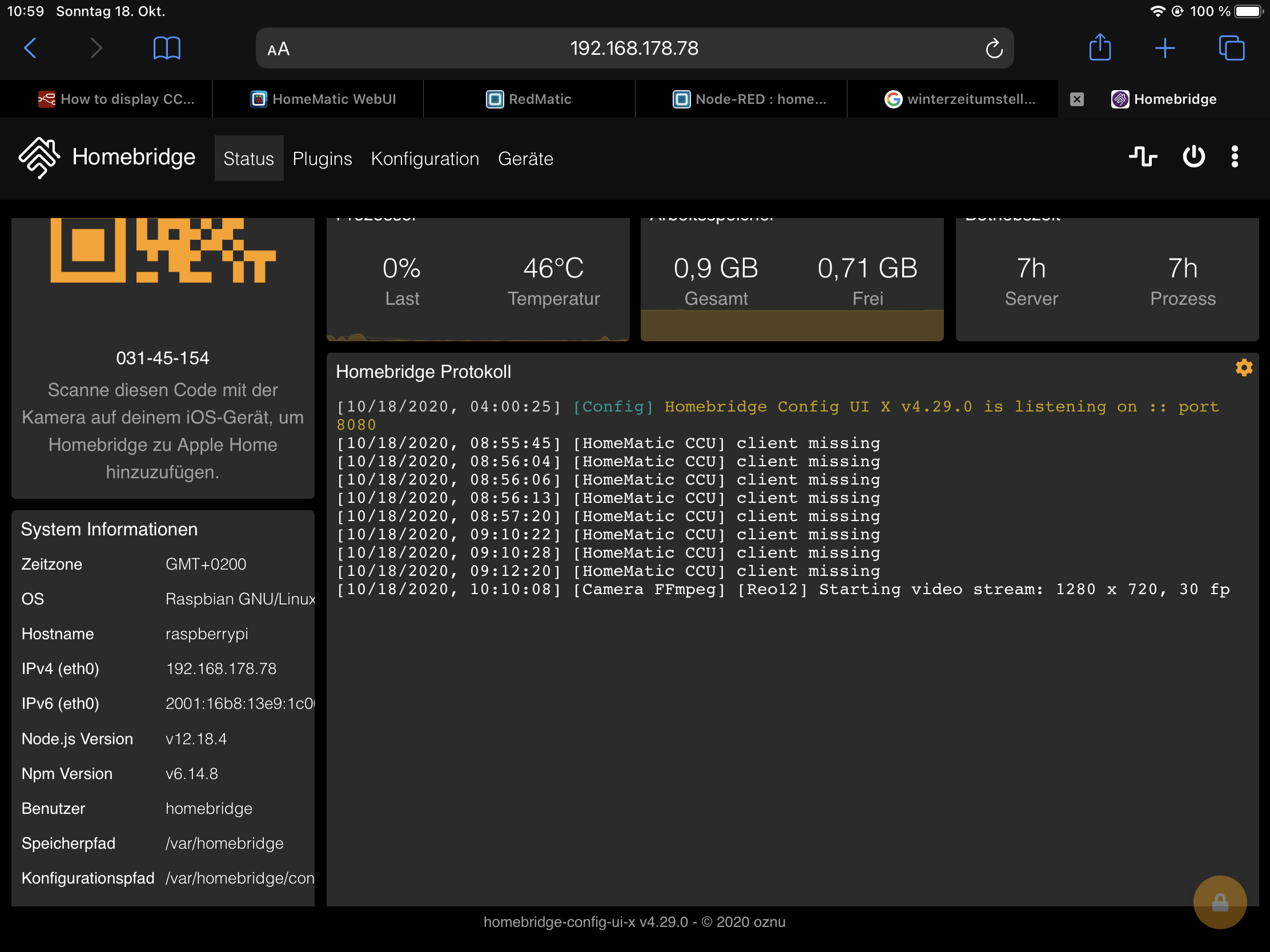 Ich betreibe auf einem Raspberry Pi 3B (Node-js und npm sind auf dem neuesten Stand) Homebridge(v0.1.231), um meine Homematic-Geräte über HomeKit steuern zu können; Raspberrymatic ist auf einem weiteren Raspberry installiert. Weil ich schon bei einer früheren Konfiguration immer wieder das Problem hatte, dass Homebridge die Stati nicht korrekt anzeigt, habe ich beim jetzigen System - wie zuvor schon - einen Cronjob eingerichtet, mit dem der Homebridge-Raspberry 1x pro Nacht neustartet. Das hilft jetzt aber nicht mehr. Bis ca. zur Mittagszeit läuft es noch reibungslos, im Laufe des Nachmittags ändert sich das dann und die Rolläden zeigen alte Stati an und lassen sich über HomeKit nicht mehr steuern. Das Gleiche gilt für Homematic-Zwischenstecker.