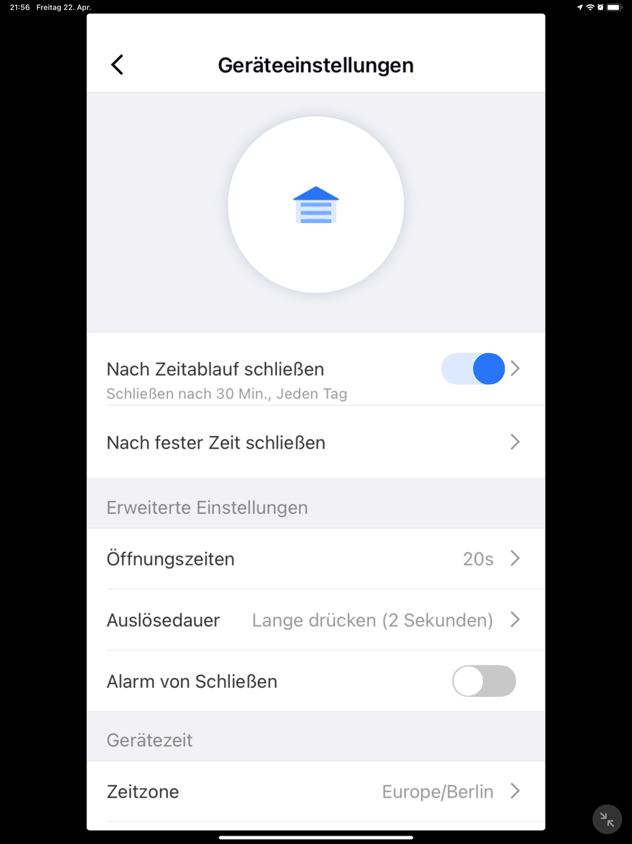 • Ist es irgendwie möglich da eine Zeitverzögerung einzubauen beim schließen. Ich würde gerne in die Garage fahren, im CarPlay Garage schließen betätigen, aussteigen raus gehen und dann soll nach x Sekunden die Garage zugehen.