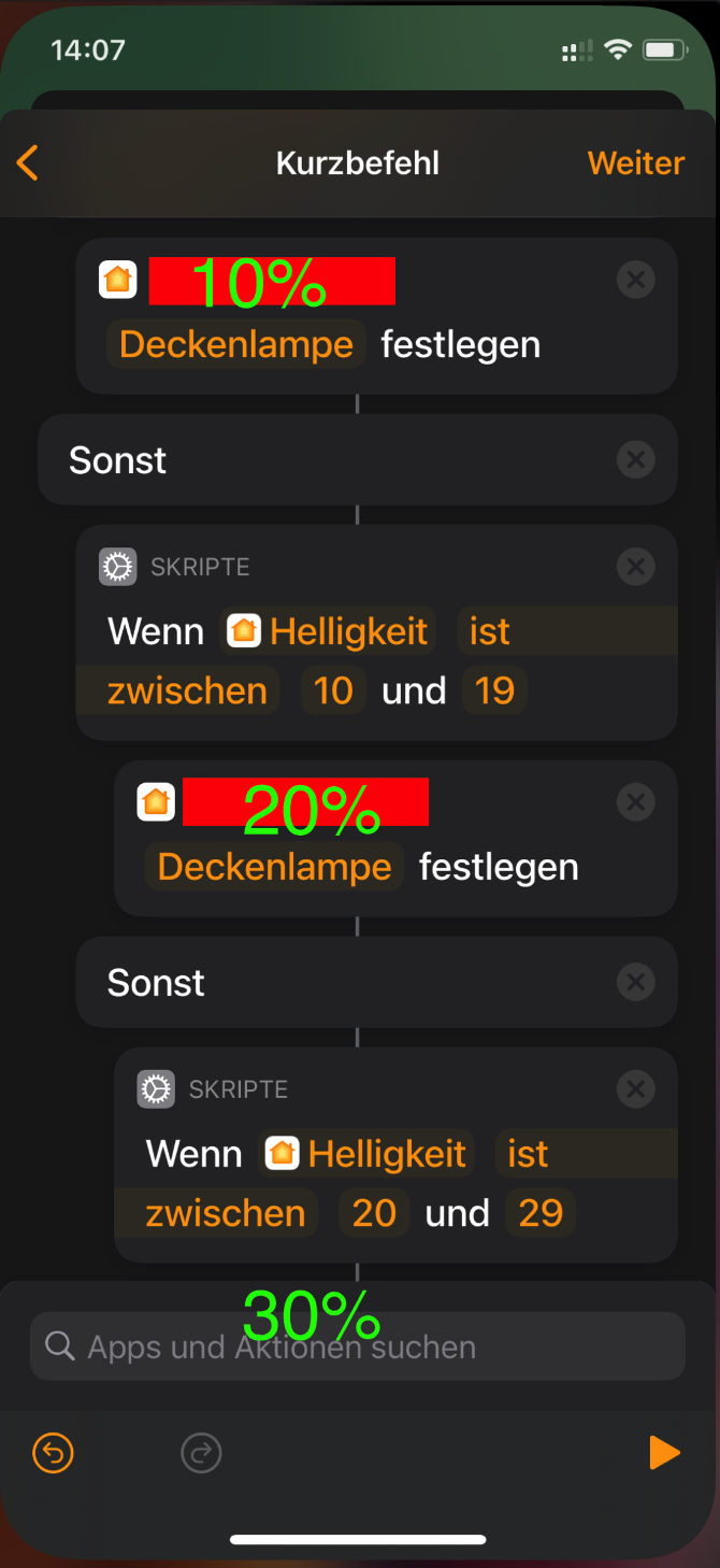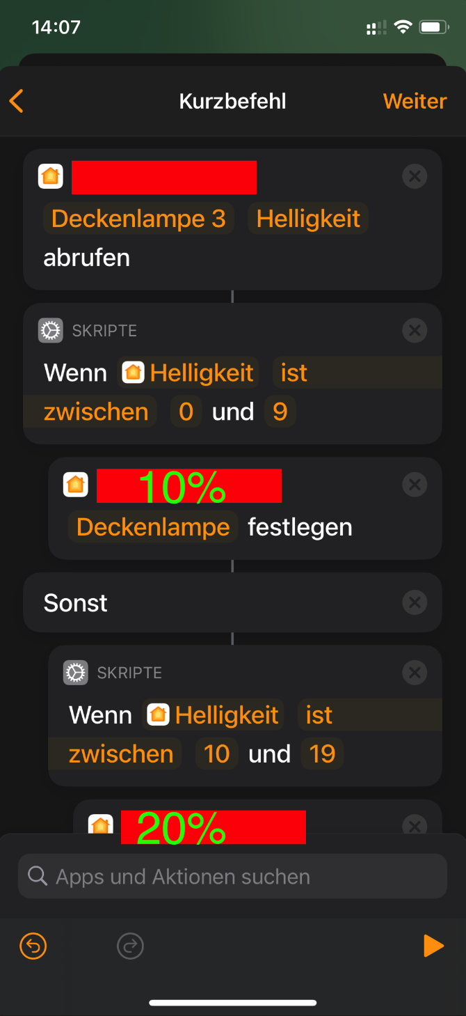 Unter HomeKit kann ich nun ja einstellen das mit einem langen Tasten eine Funktion ausgelöst werden soll. Darauf würde ich gerne eine Helligkeit+ und ein Helligkeit- legen.