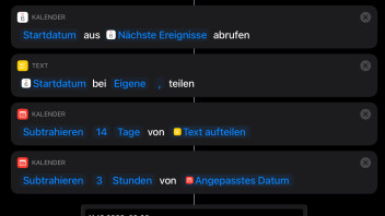ich versuche in der Kurzbefehle App von iOS einen Kalendereintrag auszulesen und daraus einen neuen Kalendereintrag 2 Wochen später zu erstellen. Das klappt auch soweit. Aber kann mir bitte jemand sagen, ob und wie es möglich ist, den neuen Eintrag immer morgens um 9 Uhr beginnen zu lassen, unabhängig davon, um welche Zeit der Ursprungseintrag war? Bei der Funktion Datum anpassen kann ich nur wählen, ob ich das Datum um Sekunden, Minuten, Tage etc. verschieben will.