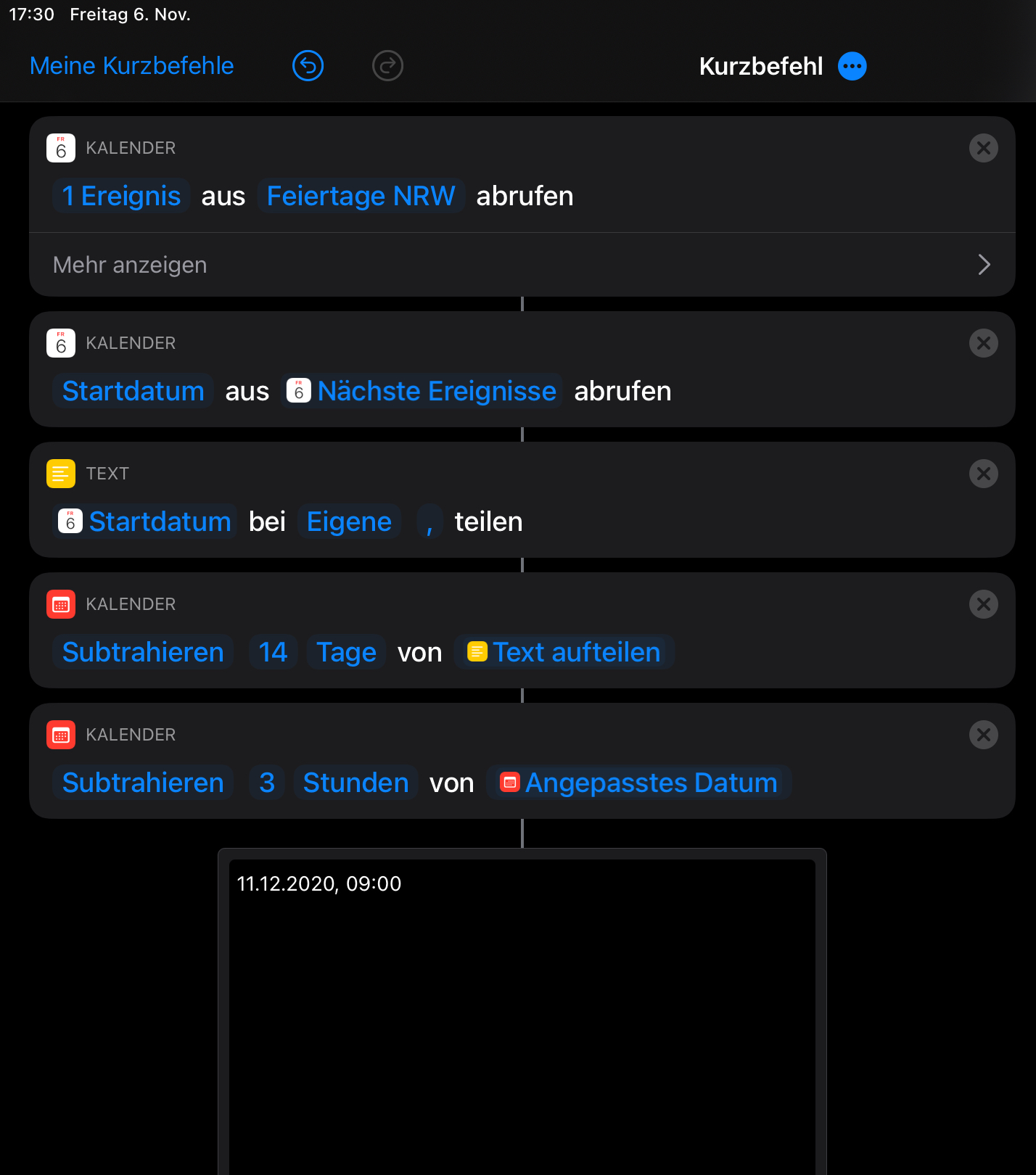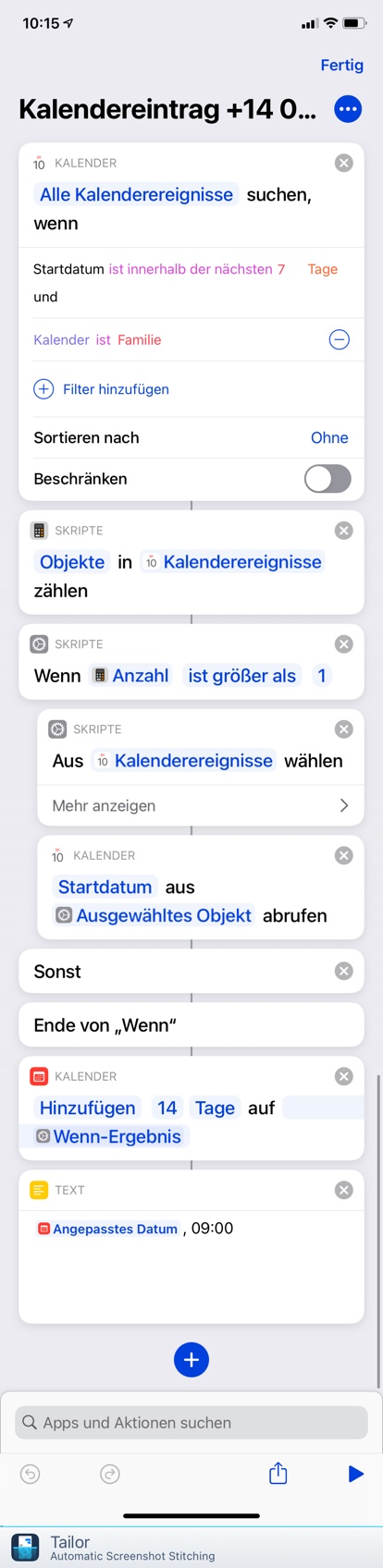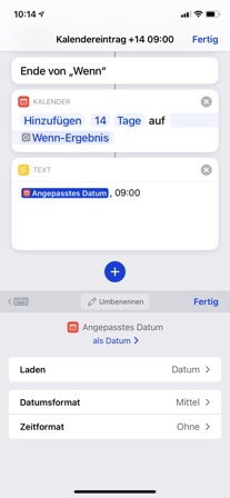ich versuche in der Kurzbefehle App von iOS einen Kalendereintrag auszulesen und daraus einen neuen Kalendereintrag 2 Wochen später zu erstellen. Das klappt auch soweit. Aber kann mir bitte jemand sagen, ob und wie es möglich ist, den neuen Eintrag immer morgens um 9 Uhr beginnen zu lassen, unabhängig davon, um welche Zeit der Ursprungseintrag war? Bei der Funktion Datum anpassen kann ich nur wählen, ob ich das Datum um Sekunden, Minuten, Tage etc. verschieben will.