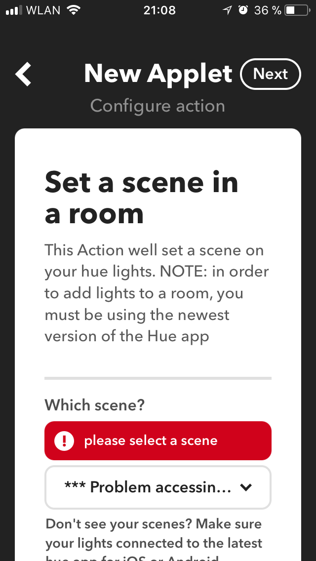 Derzeit setze ich mich etwas mit IFTTT auseinander und versuche mich in den Applets..Ich frage mich, ob man auch zwei "then"-Aktionen in einem Applet festlegen kann? Wie kann ich die Farbe in der die Lichter schalten sollen einstellen? Schaffe es derzeit nur mit der zuletzt eingestellten Farbe.