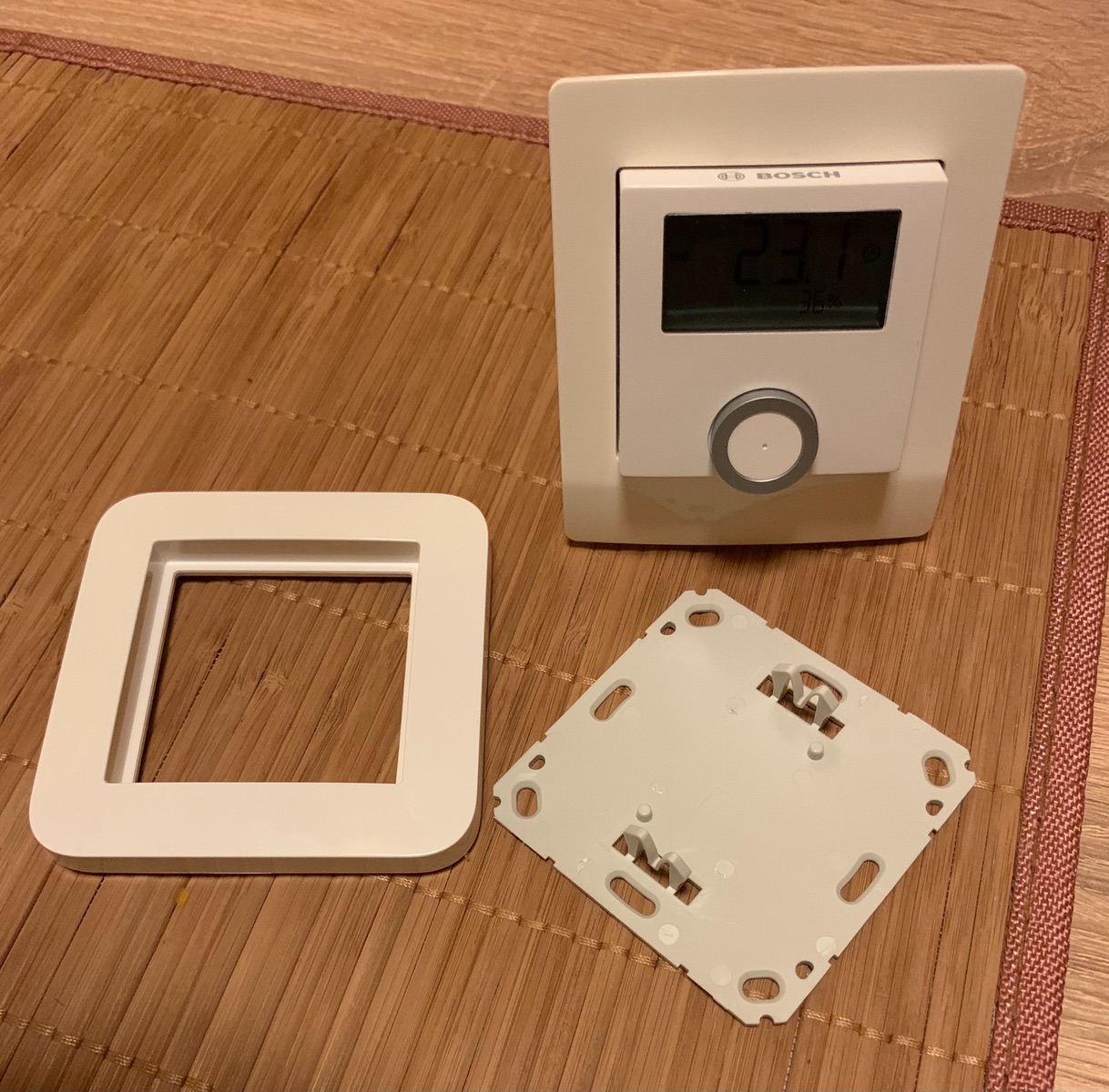 • Wie ich gelesen habe sind die Bosch Raumthermostate designmäßig ein wenig angepasste Lizenzprodukte auf Homematic Wandthermostat Basis und diese passen ins 55er Format.