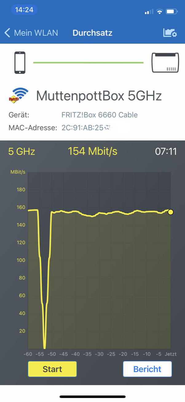 Vom Verhalten ist es dabei egal, ob iPhone, MacBook oder PC, egal, ob 2,4 oder 5 GHz. Der dargestellte Verbindungsabbruch kommt immer früher oder später zu Stande. Ist die Unterbrechung etwas länger, hilft es, das WLAN am Gerät einmal aus und wieder an zu schalten. Dann läufts wieder. Gilt auch für alle Arten von geraten. Interessant ist hier: