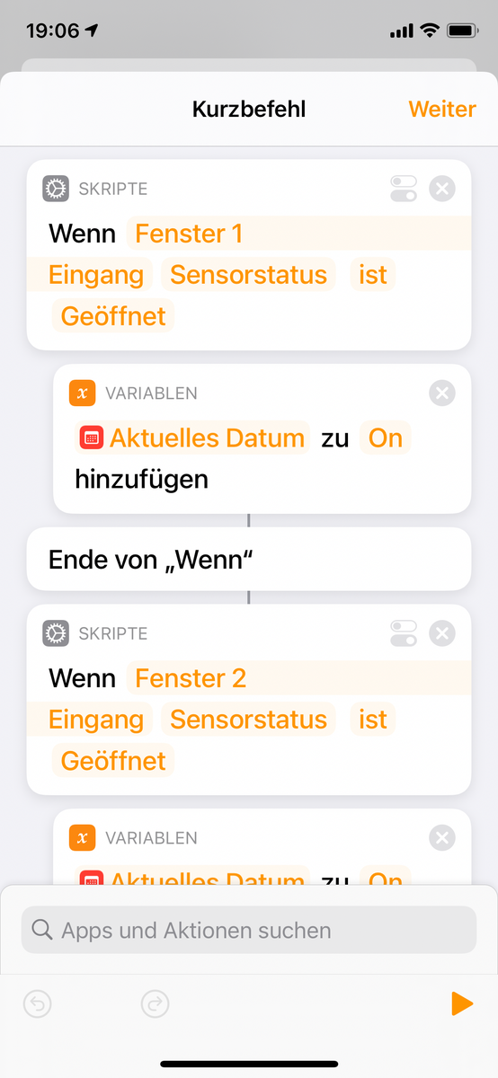 Dieser Kurzbefehl prüft ob ein "Fenster offen" ist und legt am Ende diesen Status fewt, wenn ein Fenster offen ist Das ist eine der letzte Befehl des Kurzbefehls: "Fenster Offen" festlegen.
