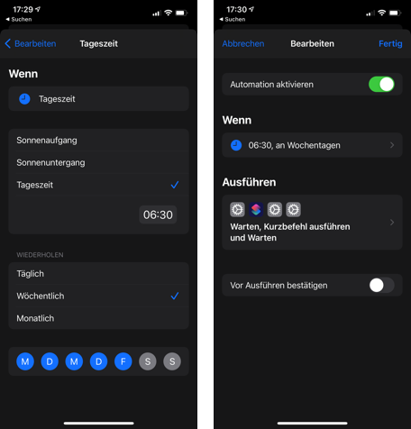 Positiv ist inzwischen dass "Wenn" Tageszeit, wöchentlich Mo-Fr ausgewählt werden und "Vor Ausführen bestätigen" deaktiviert werden kann.