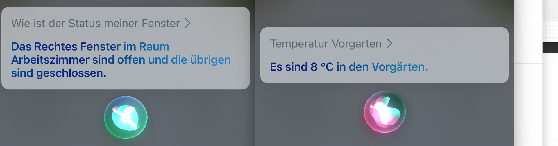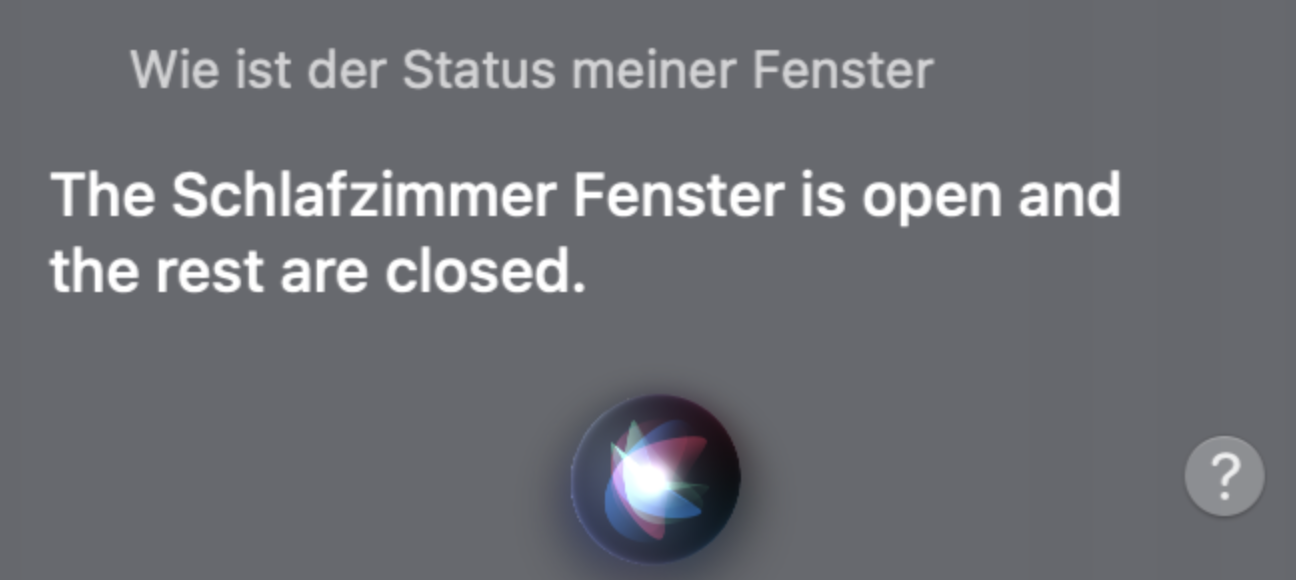 • Ja, Siri macht meine Wohnung teilweise zum Palast: "Es sind 20º Celsius in den Küchen." Auch in den Toiletten, aber nicht in den Zimmern. Alles, was auf "zimmer" endet, wird holprig, aber korrekt gesprochen ("in dem Schlafzimmer", "in dem Badezimmer"). In allen genannten Räumen stehen Hue-Bewegungsmelder, die ja auch die Temperatur messen.
