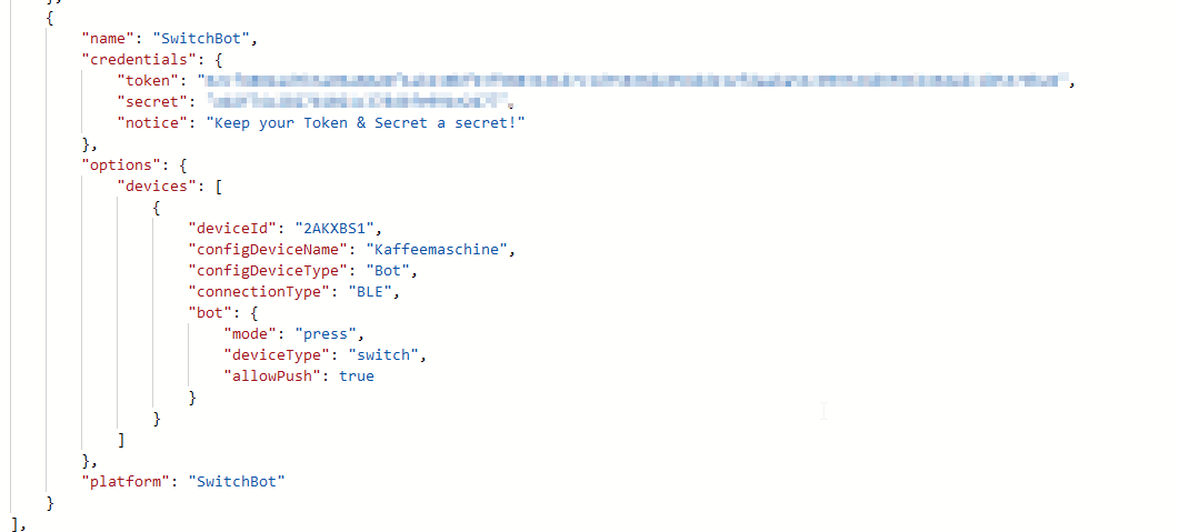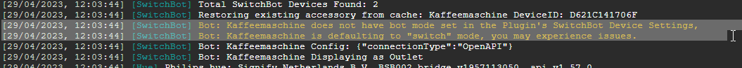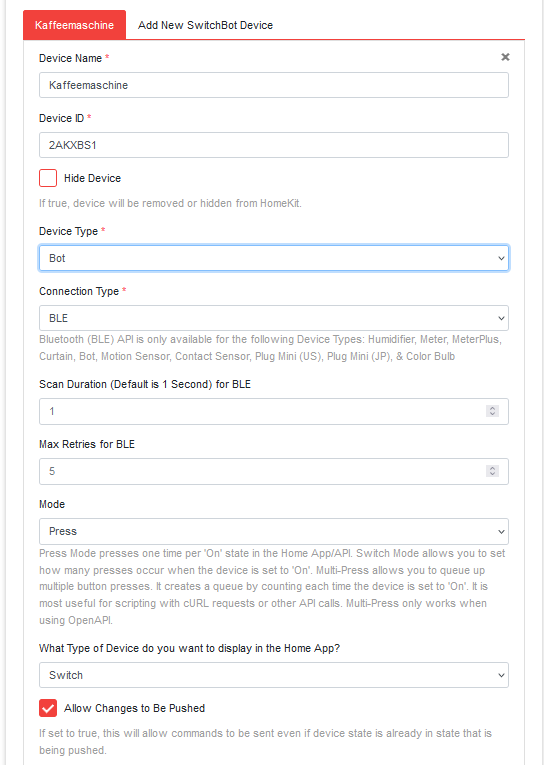 mein Switchbot Bot kam vorhin an und ich wollte ihn nun über Homebridge einbinden, dabei bekomme ich aber eine Fehlermeldung, die meiner Meinung nach, nicht kommen dürfte.