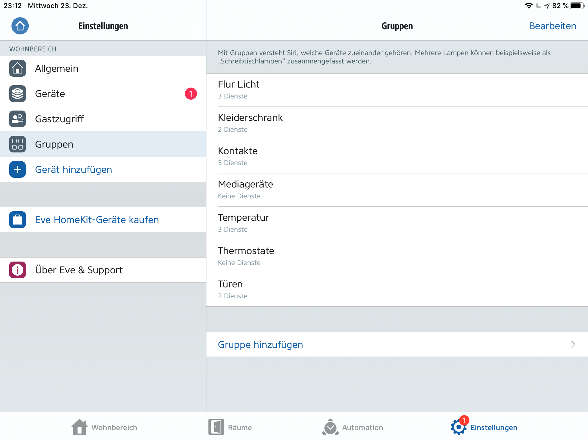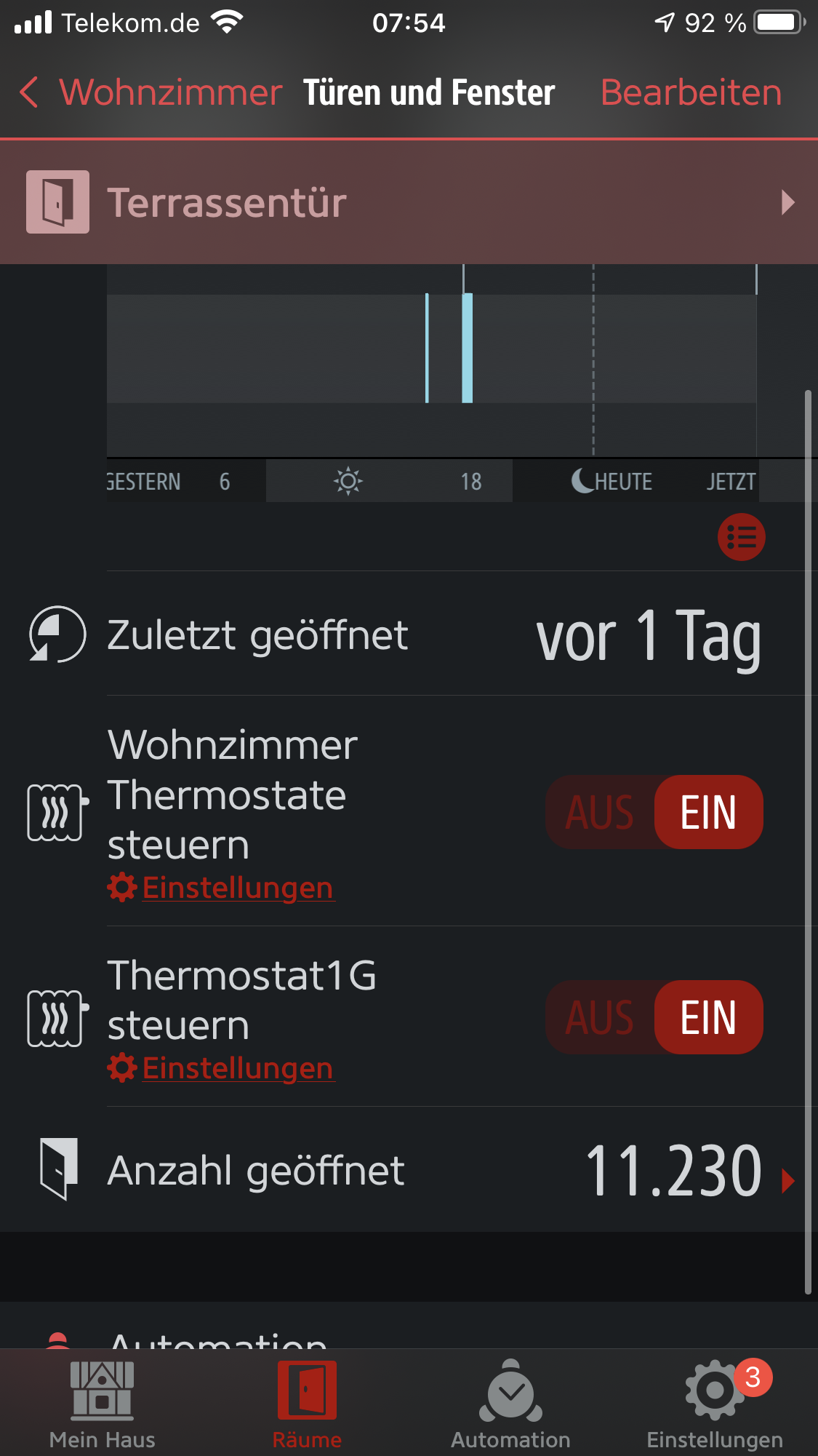 Ich habe im Wohnzimmer zwei Eve Thermostate (Namen Thermostat1G und Thermostat2C) und ein Eve Fensterkontakt für die Terrassentür. Die Software ist überall auf dem aktuellen Stand, bei den Eve Geräten und bei HomeKit und der Eve App. Bei beiden Thermostaten ist die Fenstererkennung aktiviert (schaltet bei offener Terrassentür das Thermostat aus).