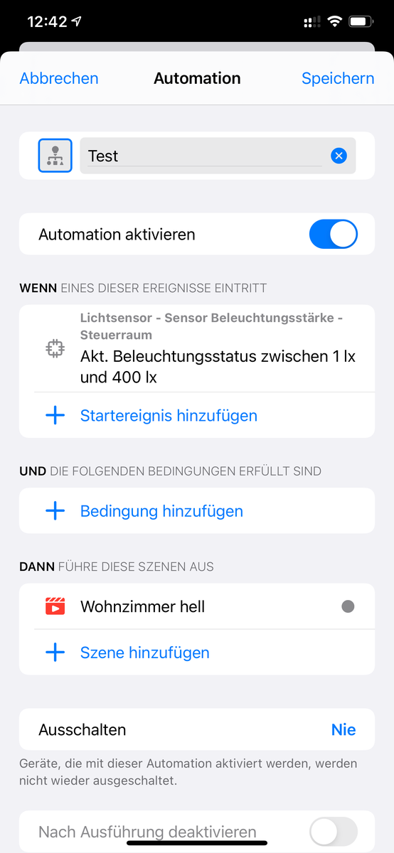 Ich kann zwar eine solche Sache über die App "Controller" oder die "Eve" App einrichten, aber es funktioniert nicht. Kann aber auch der üblicher Anwenderfehler sein.