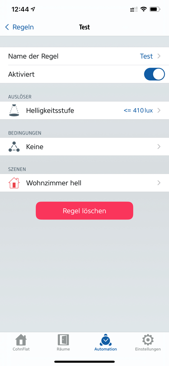 Die Wohnzimmerlampen sollen ab einer bestimmten "natürlichen" Helligkeit einschalten, wenn ich zu Hause bin. Fernziel wäre es dann noch, die Helligkeit der Hue-Lampen entsprechend des Außenlichtes adaptiv zu gestalten. Als Sensor dient ein Hue Motion-Sensor, der das Außenlicht einfängt und eigentlich nur als Helligkeitssensor fungiert.