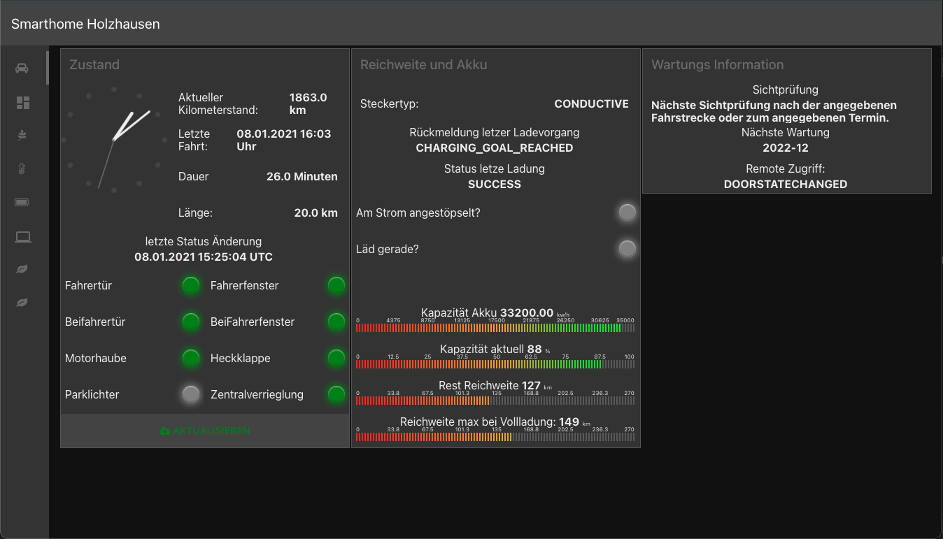 Da auch Strecken und die Dauer dafür ( immer nur die letzte) aufgezeichnet werden, schieb ich das noch auf eine Grafana Seite und schriftlich das mit - wie auch en Kilometerstand.