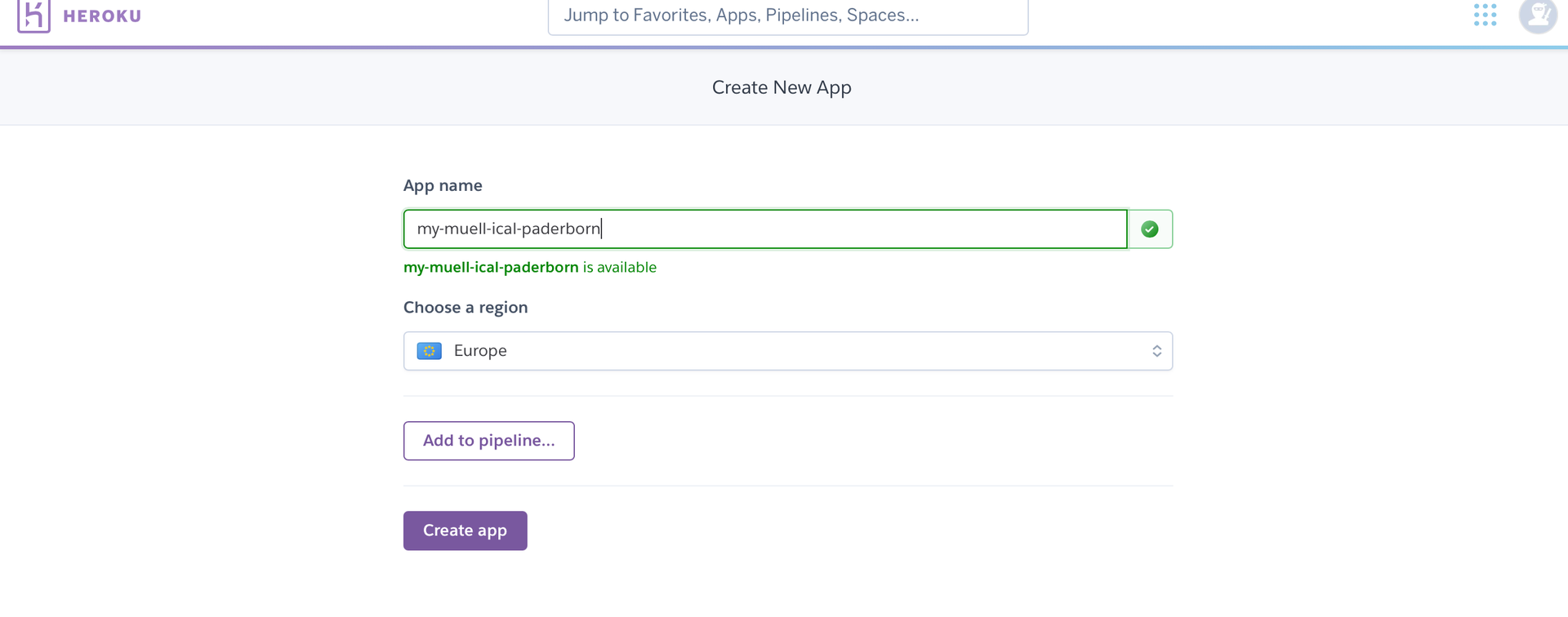 5. Name der App vergeben und Region auswählen: