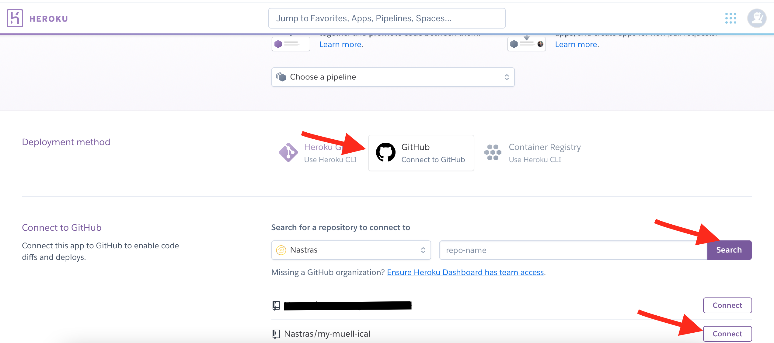 Dazu connect to GitHub auswählen und anschließend seinen Fork suchen und eine Verbindung herstellen über den Connect Schalter und Deploy Branch auswählen.