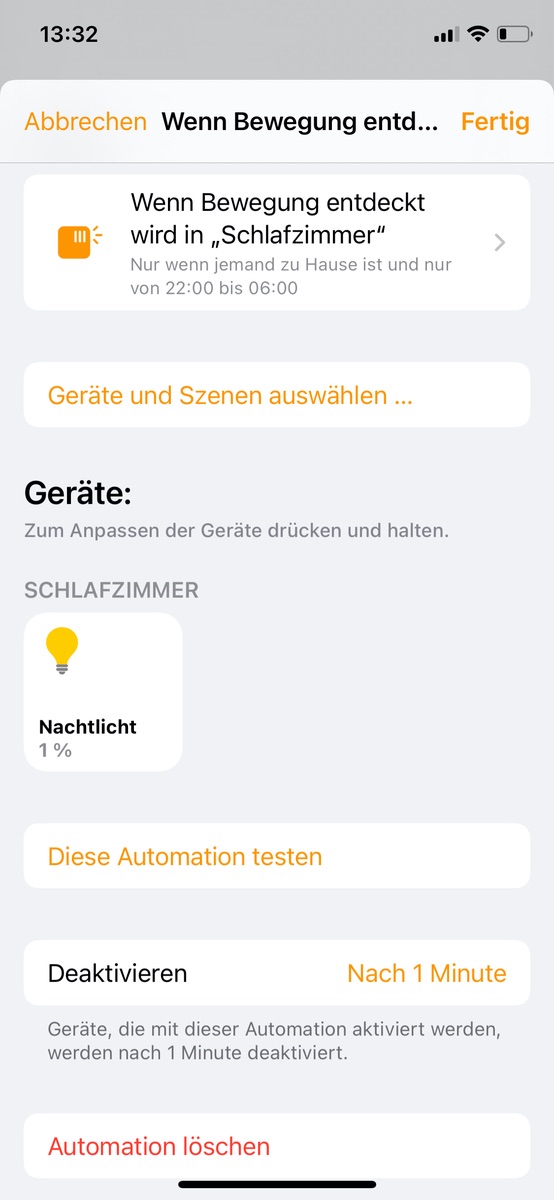 ich möchte mit meinem iPhone eine persönliche Autmation erstellen, die beim Erkennen eines NFC Tags meine Nachttischlampe zunächst auf 1% Helligkeit dimmt, dann 5 Minuten wartet und dann die Lampe ausschaltet.