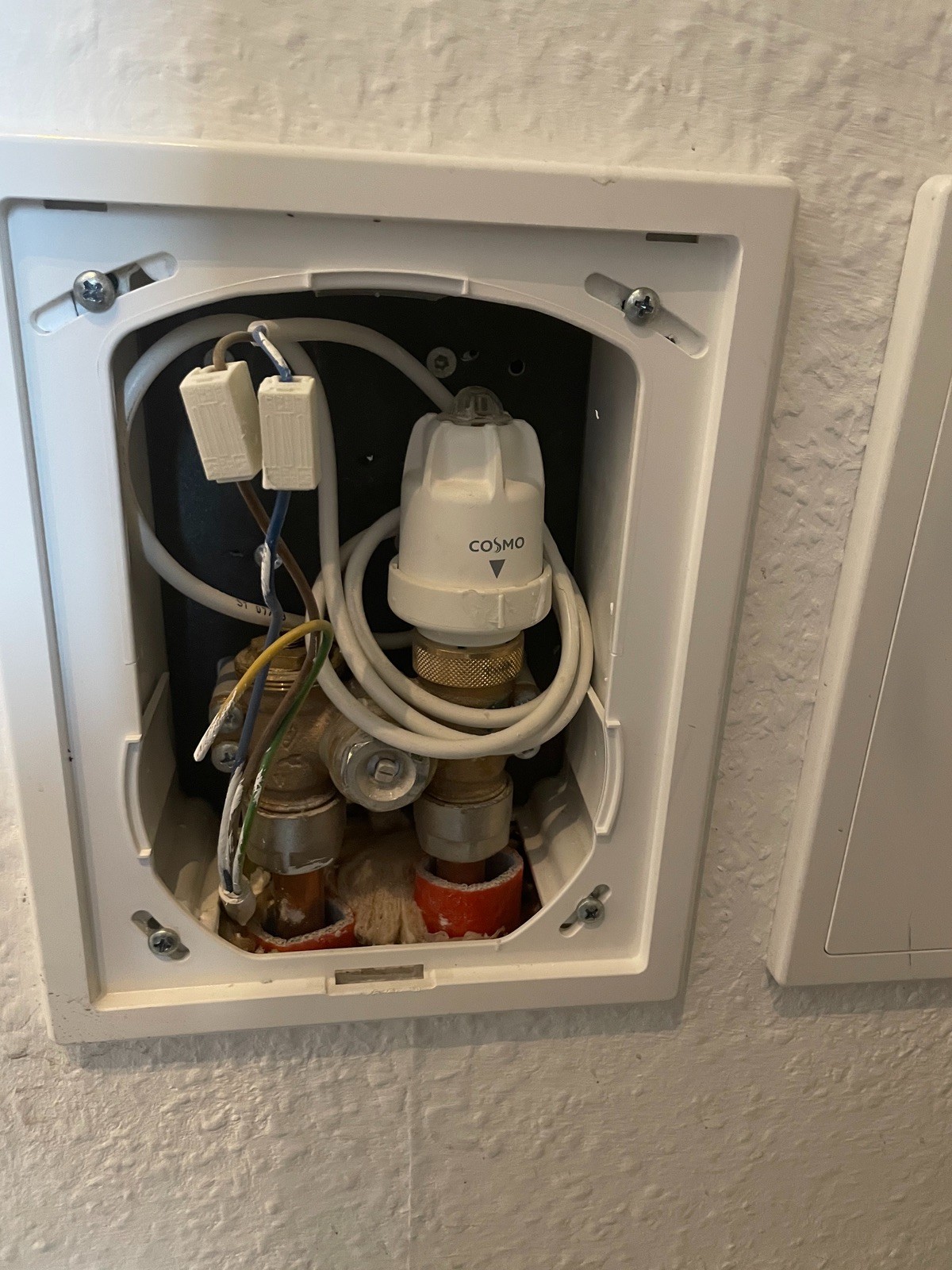 • Das blaue und braune Kabel kommt vom stellantrieb. Das ist sonst nichts angeschlossen. Der Thermostat und auch die Steckdose und Schalter darunter hängen an der gleichen Sicherung. Wie bekomme ich raus ob am Thermostat und an der Steckdose die gleiche Phase anliegen? Hab noch ein Foto vom stellantrieb angehängt. Einen Schaltplan finde ich leider keinen im Netz. Nur die kurz gehaltene Anleitung von Bosch.