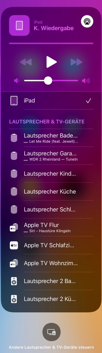 Das führt standardmäßig dazu, dass der Song auf beiden HomePods gespielt wird. Klar, ich kann sagen „spiele auf HomePod Büro“.