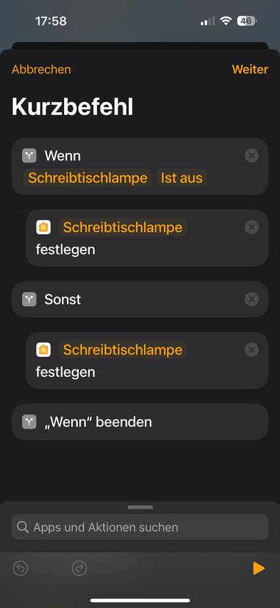 Das geht in HomeKit, indem Du dem Button keine Szene zuweist, sondern einen Kurzbefehl. Wenn „Licht aus“, dann „Licht an“, sonst „Licht aus“.