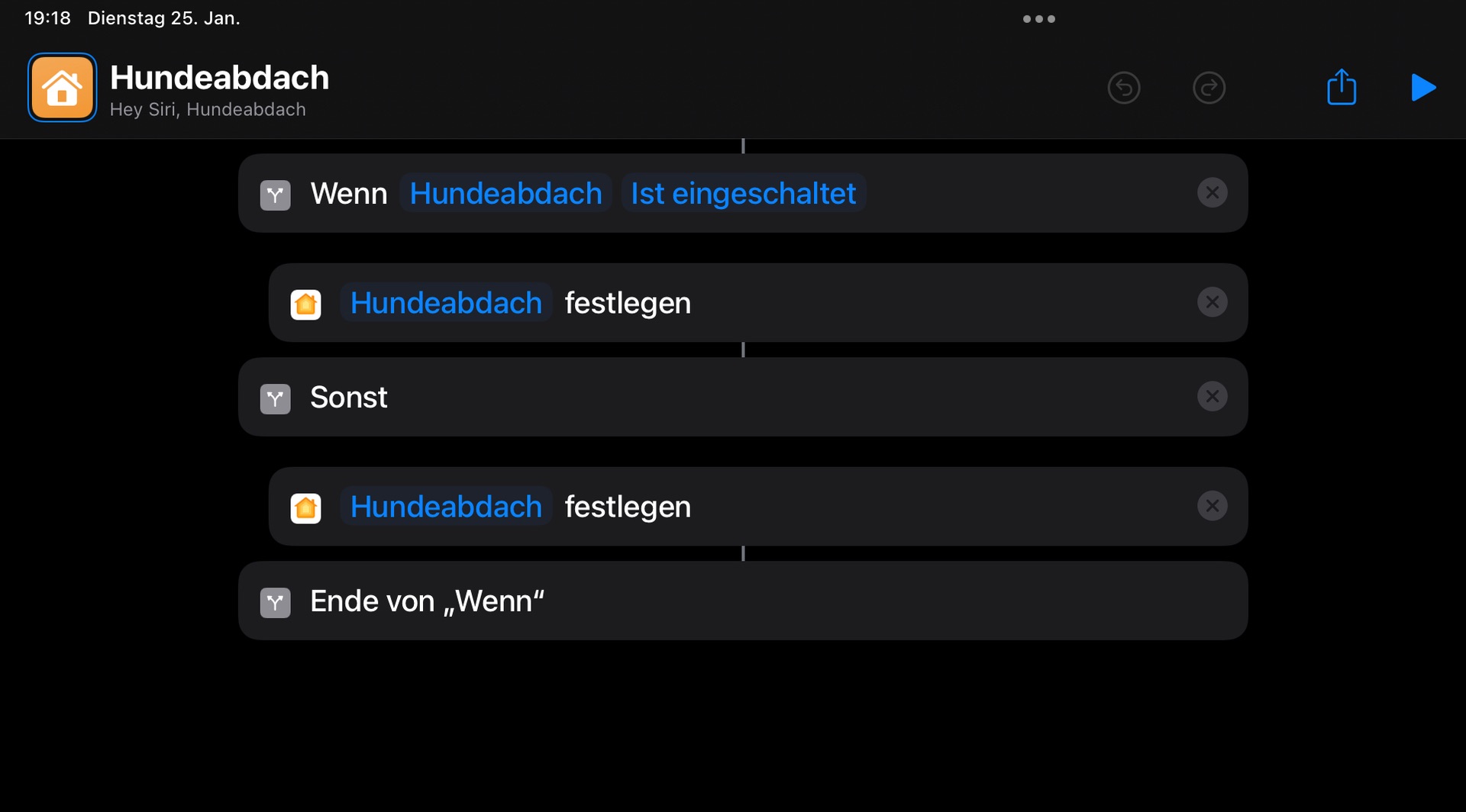 Es wäre einfach wenn ich in Home sagen könnte Kurzbefehl ausführen, somit könnte ich ihn auf den anderen verweisen. Leider geht das nicht.