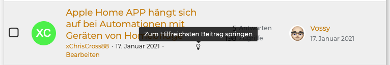 Daraus ergibt sich meiner Meinung nach ein Problem. Wenn alles z.B. zu einem smarten System in einem Thema gepostet wird gehen Fragen schnell unter wenn schon nur ein oder zwei Leute danach in diesem Thema gepostet haben.