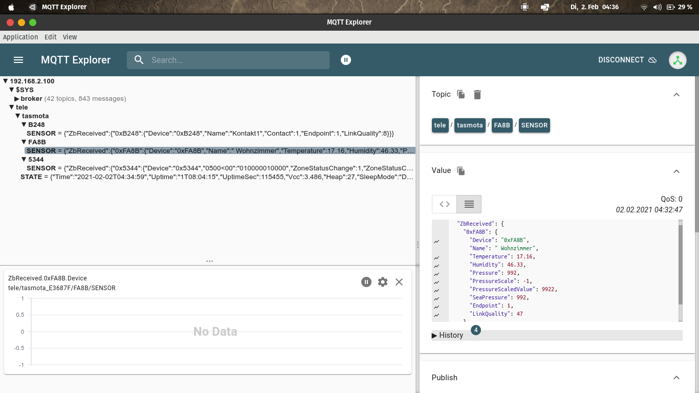 ich habe ein Sonoff Hub mit Tasmota, dort sind einige Sensoren eingebunden. Die übertragen auch schön ihre Daten an Mosquitto, das kann ich mittels MQTT Explorer überprufen.