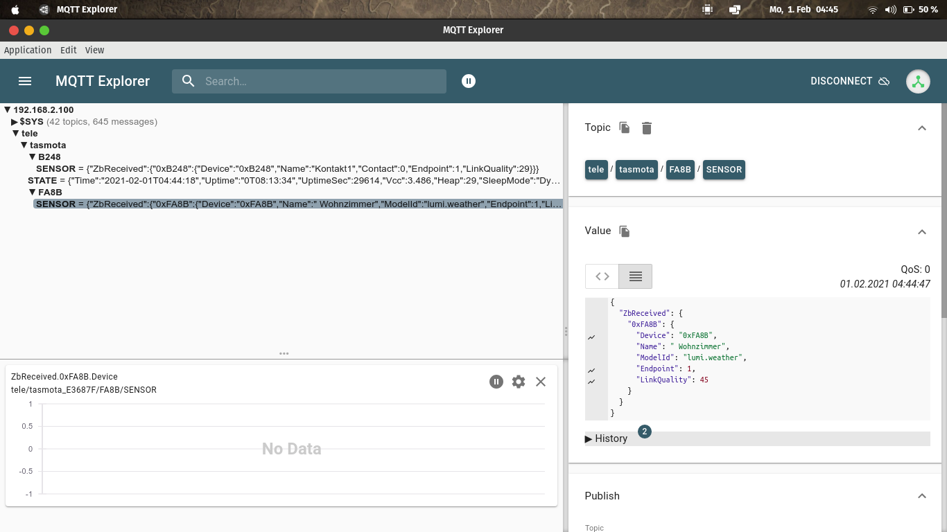 ich habe ein Sonoff Hub mit Tasmota, dort sind einige Sensoren eingebunden. Die übertragen auch schön ihre Daten an Mosquitto, das kann ich mittels MQTT Explorer überprufen.
