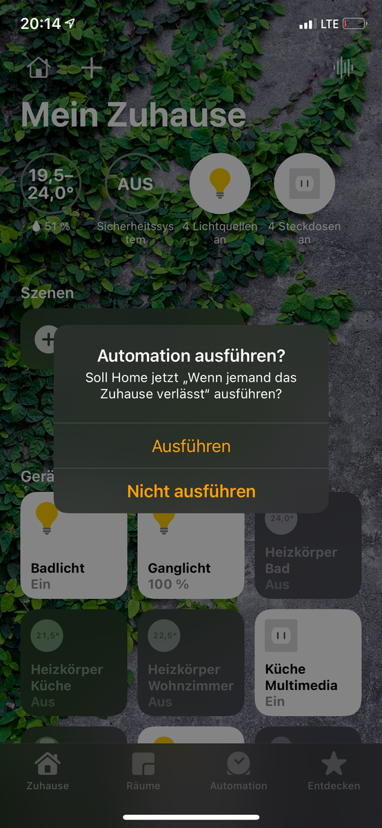- Wenn zuHause verlassen -> schalte „Alarmanlage Automation“ EIN