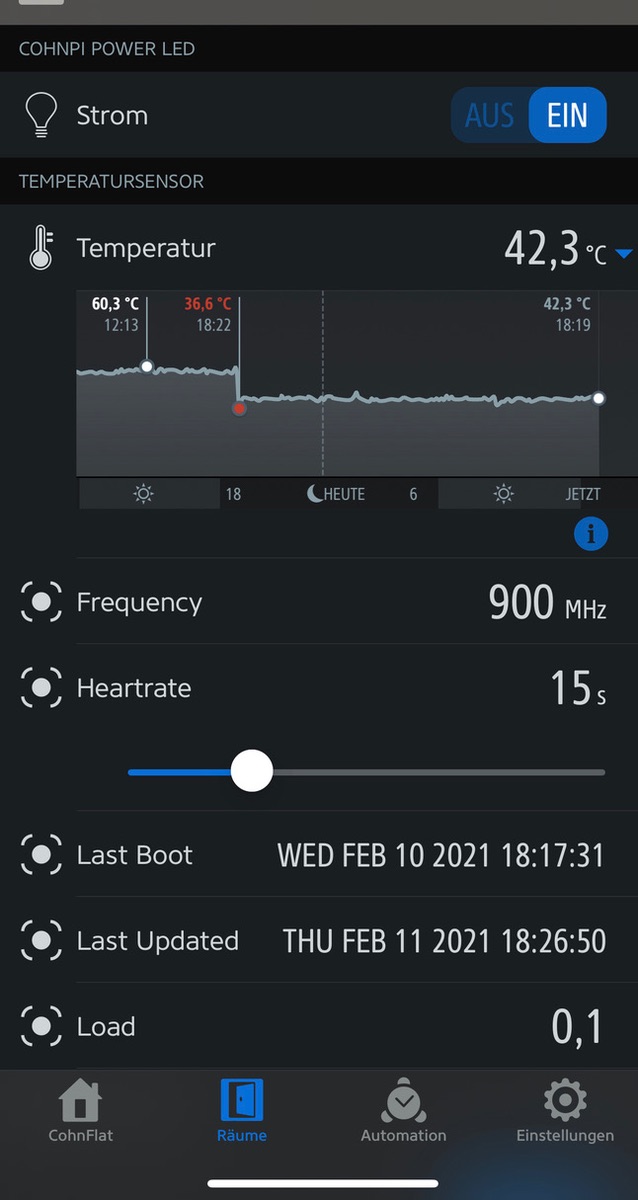 nachdem mein Raspberry Pi 4B mit Homebridge läuft und auch die Einbindung der Shellys wunderbar funktioniert hat, wollte ich jetzt den Komfort etwas erhöhen. Beim Zugriff auf den Pi über einen Browser wird mir die aktuelle Temperatur angezeigt. Ich hab über Google eine Möglichkeiten gefunden, dass der Pi eine txt-Datei anlegt und minütlich die Temperatur logt. Gibt es so etwas auch als Grafik ohne extra Datei, z.B. Termperaturverlauf der letzten 7 Tage? Kann man sich nachrichtlich benachrichtigen lassen, wenn die Temperatur einen Wert x übersteigt?