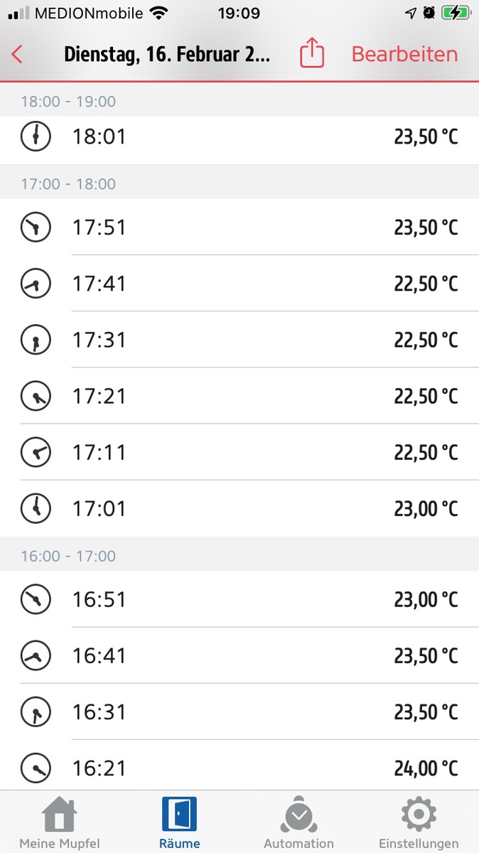 Heute hat er dann auch in den 16 Grad Perioden geheizt. Das kann ich für gestern nicht beurteilen weil Sonntags sowieso fast durchgehend geheizt wird.