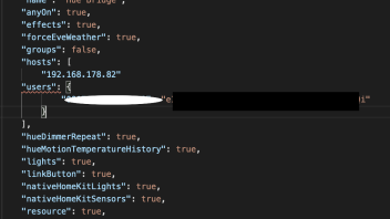 Diesen Usernamen musst du dann in die Konfiguration eintragen. Rufe die grafische Oberfläche auf, klicke oben auf Plugins, dann auf den Schraubenschlüssel bei Homebridge Hue, dann auf JSON-Konfiguration. Bei mir sieht das dann so aus: