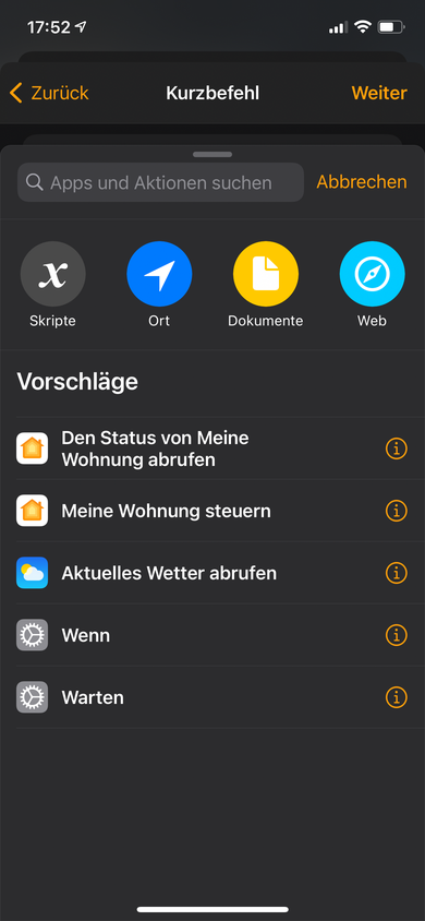 Mein Problem ist nun, dass ich bei den Kurzbefehlen (innerhalb der Home App, wenn ich einen Schalter konfiguriere) keine Apps auswählen kann, keine anderen Kurzbefehle, usw. Ich kann lediglich irgendwelche unnötigen Skripte laufen lassen, die mir in der Situation halt gar nichts bringen.