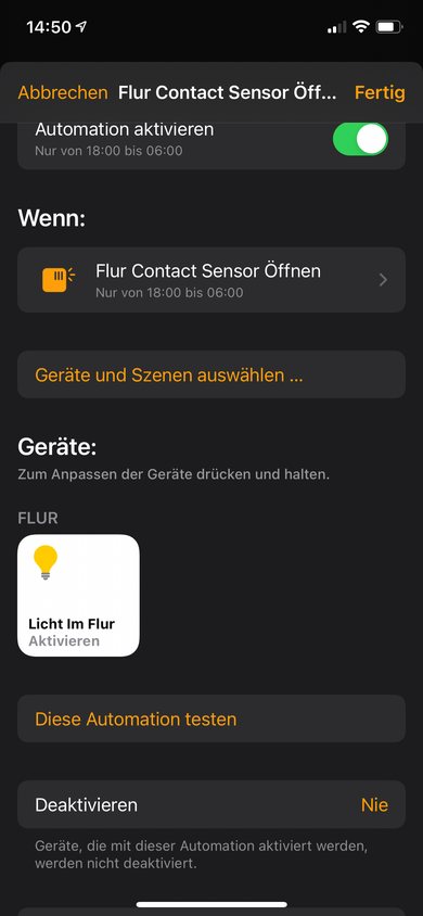 Ich habe im Flur eine kleine Leuchte stehen die ich über eine schaltbare Steckdose von Meross verbunden habe.