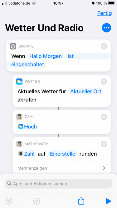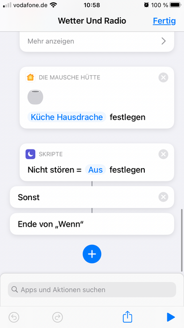 Mittels Dummy Schalter und BMW wird die Morgenszene gestartet (Licht an, Rollos öffnen usw.) Da das eine Automation ist, wollte ich daran noch einen Kurbefehl hängen: der Kurbefehl soll ebenfalls durch das Einschalten des Dummy-Schalter ausgelöst werden. Der Kurzbefehl enthält eine Sprachausgabe auf dem HomePod mini. Der Kurbefehl startet jedoch nicht, bzw. spuckt der HP mini keinen Ton aus. Hier der Kurzbefehl: