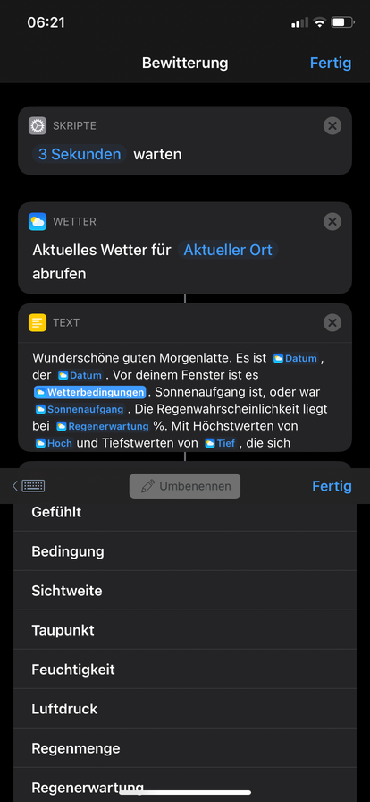 Der Kurzbefehl wird nur dann ausgeführt, wenn dein Gerät "Hallo Morgen" eingeschaltet ist, aber nicht wenn es eingeschaltet wird. Wenn du also deinen Kurzbefehl manuell ausführst, dann spricht dein HomePod den Text, aber nur dann, wenn "Hallo Morgen" eingeschaltet ist. Ist "Hallo Morgen" ausgeschaltet, dann passiert nichts.