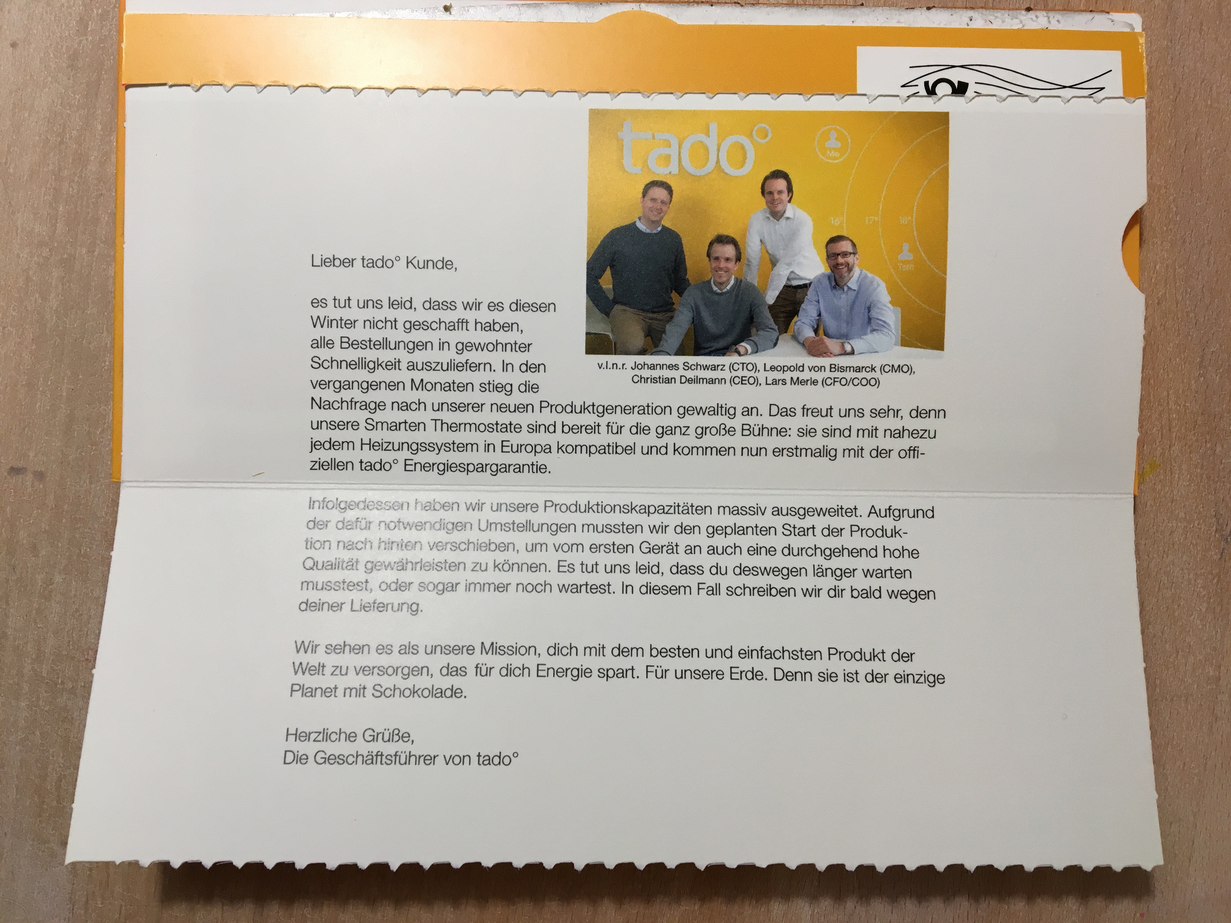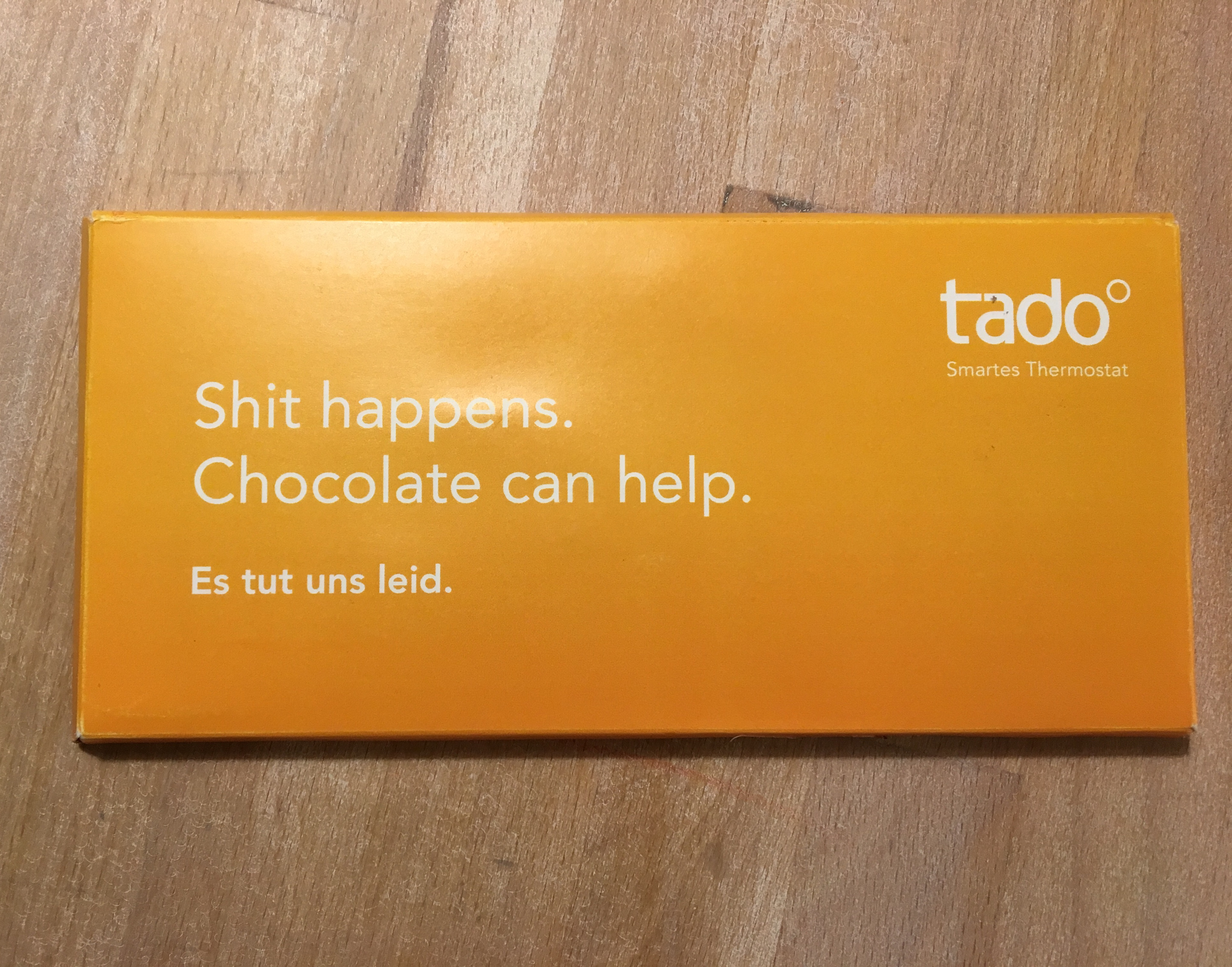 Hab die auch bekommen, finde es eine nette geste von Tado nur die Schoko ist mir zu bitter