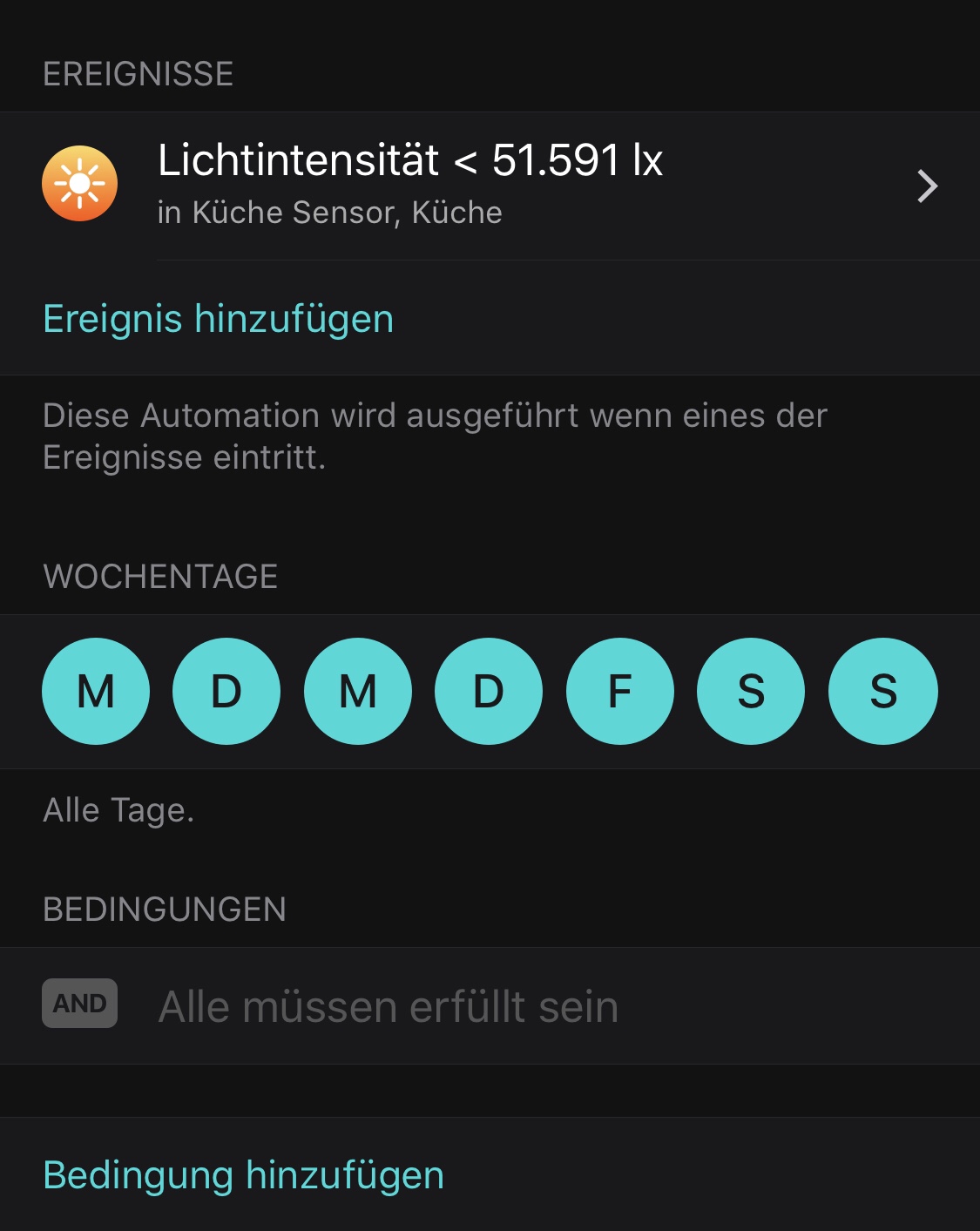 Ich habe jetzt einen Hue Motion um das Licht in unserer Ankleide automatisch schalten zu können. Nun habe ich Homekit so konfiguriert, dass das auch funktioniert wie es soll. Allerdings würde ich das Ganze gerne Anhand der Helligkeit im Raum und nicht anhand der Tsgeszeit aktiv/inaktiv schalten. Sprich bei weniger als 30 Lux wird die Automation altiv, ansonsten nicht. Bislang kann ich nur sagen, dass das nur Nachts aktiv wird. Aber das muss doch auch irgendwie in Abhängigkeit von der vom Sensor gemessenen Helligkeit gehen?