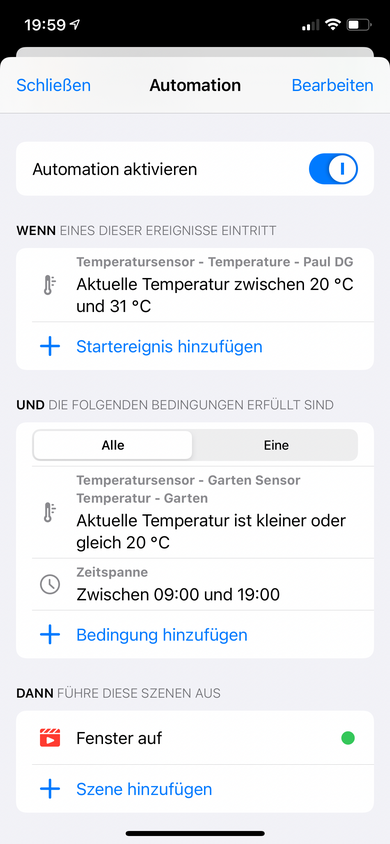 im Spitzboden habe ich ein Velux-Fenster mit Homekit-Integration und einen Aqara-Temperaturfühler, im Garten Hue-Sensoren mit Temperatursensor. . Zur Unterstützung der Klimaanlage würde ich gerne das Fenster immer öffnen, wenn es draußen kälter ist als drinnen und die Wohlfühltemperatur noch überschritten ist.